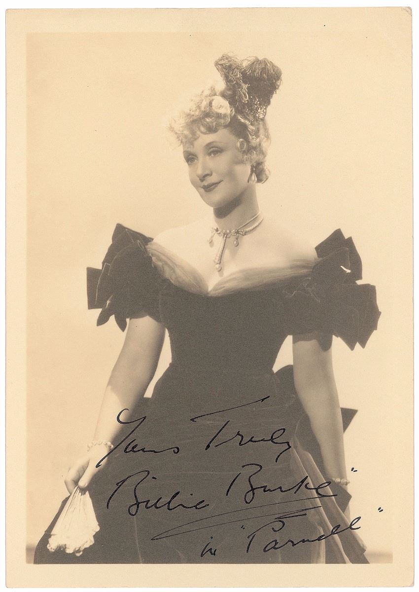 Lovely vintage matte-finish 5 x 7 photo of Burke as Clara Wood from the 1937 film Parnell, signed in fountain pen, “Yours truly, Billie Burke, in ‘Parnell.’” In fine condition, with trivial creasing to upper right corner tip.