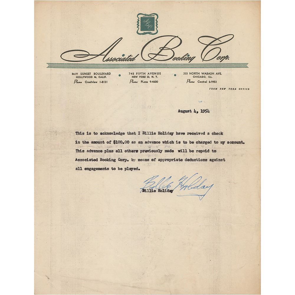 DS, one page, 8.5 x 11, August 4, 1954. Typed on Associated Booking Corp. letterhead, Holiday confirms an advance payment: "This is to acknowledge that I Billie Holiday have received a check in the amount of $100.00 as an advance which is to be charged to my account. This advance plus all others previously made will be repaid to Associated Booking Corp. by means of appropriate deductions against all engagements to be played." Signed neatly at the conclusion by Billie Holiday. In very good to fine condition, with light soiling and overall creasing. The year 1954 was an eventful one for Holiday, who released her self-titled third album and embarked on her first European tour as part of a Leonard Feather package, visiting Sweden, Germany, Netherlands, Paris, and Switzerland.