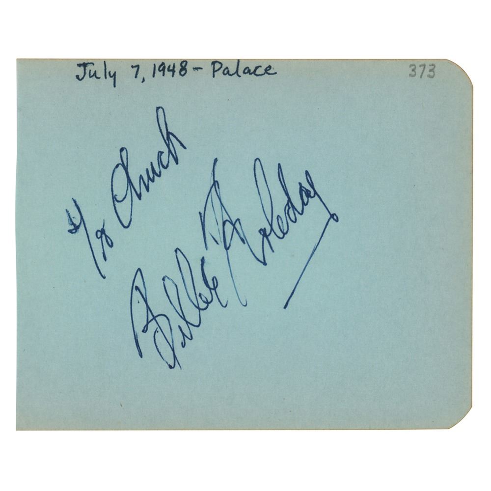 Sought-after vintage fountain pen signature and inscription, "To Chuck, Billie Holiday,†on a light blue 5 x 4 album page, annotated along the top by the collector: "July 7, 1948 - The Palace." In very fine condition.