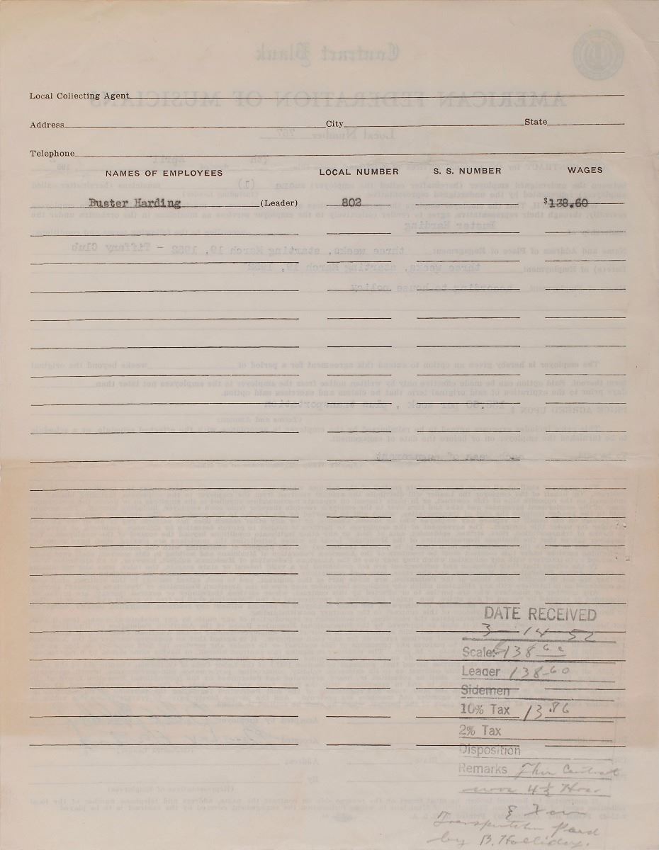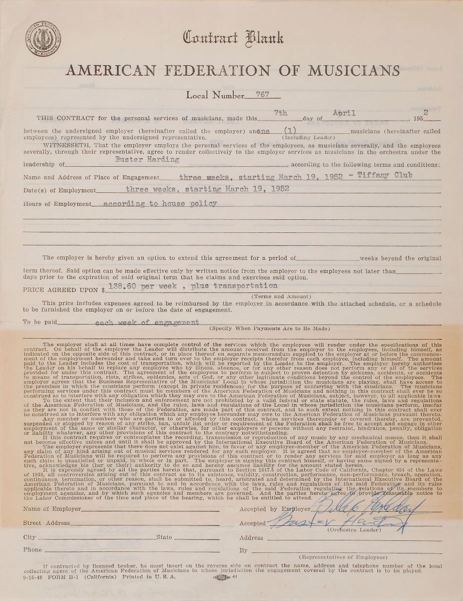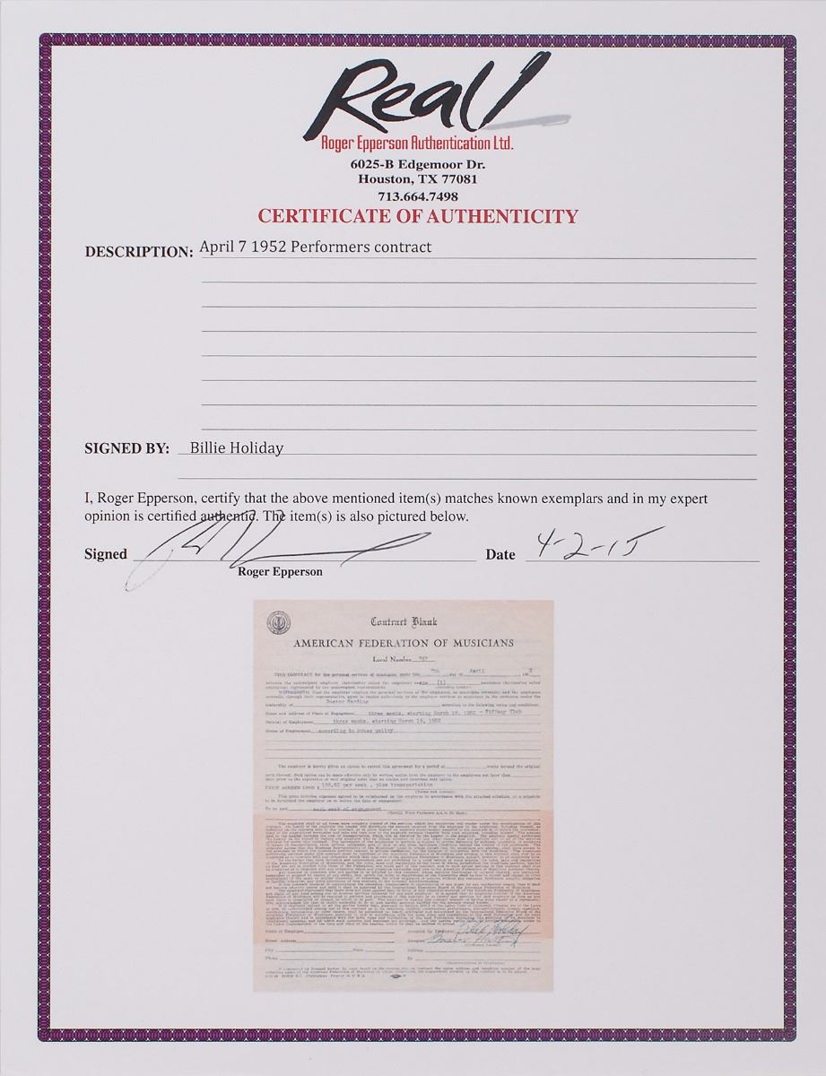 DS, one page, 8.5 x 11, April 7, 1952. American Federation of Musicians contract between Holiday and her pianist and musical director Buster Harding, in which the latter agrees to play a three week engagement at the Tiffany Club in Los Angeles starting March 19, 1953, for a weekly price of $138.60. Signed at the conclusion in blue ballpoint by Holiday as the employer, and countersigned by Harding as the orchestra leader. In very good to fine condition, with a block of toning covering signature area. Accompanied by a full letter of authenticity from REAL, and an unsigned modern photo of Holiday.
