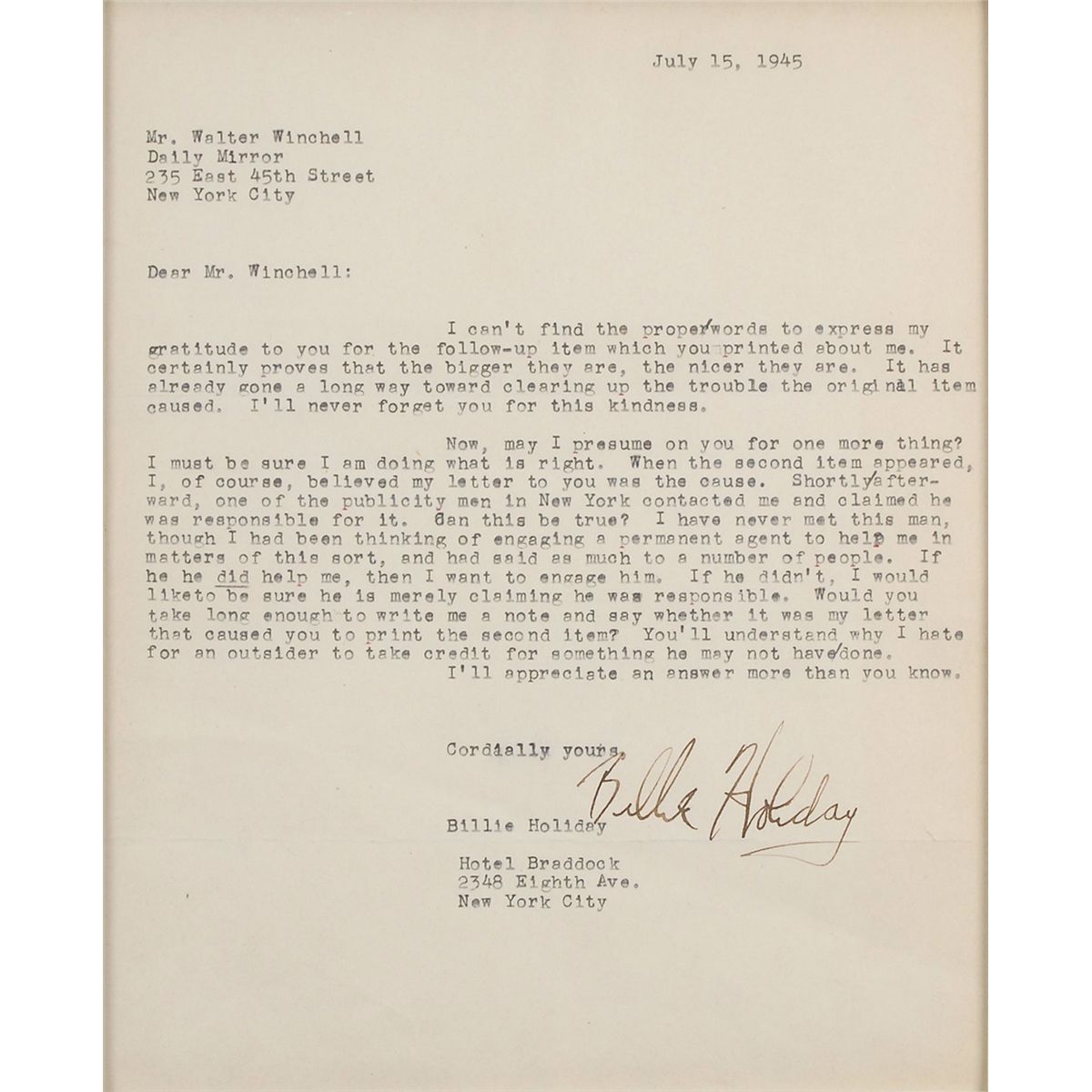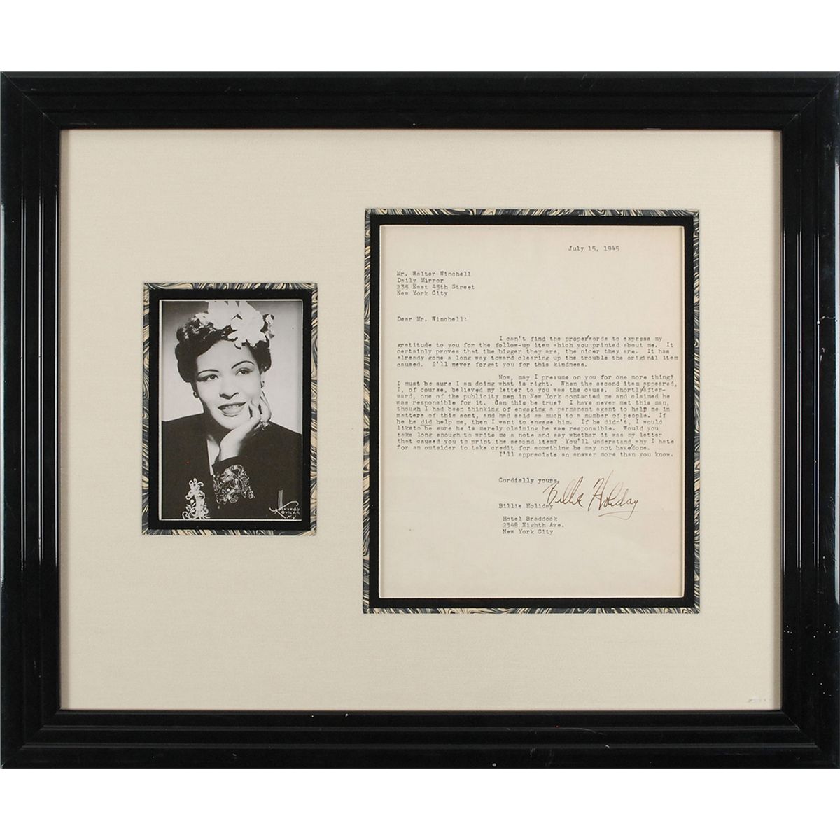 Legendary singer (1915–1959), revered as one of the greatest and most individual vocalists in the history of blues and jazz, who died from cirrhosis of the liver at the age of 44. TLS, one page, 7.5 x 9.5, July 15, 1945. Letter to Walter Winchell. In part: “I can’t find the proper words to express my gratitude to you for the follow-up item which you printed about me. It certainly proves that the bigger they are, the nicer they are. It has already gone a long way toward clearing up the trouble the original item caused, I’ll never forget you for this kindness…I, of course, originally believed my letter to you was the cause. Shortly afterward, one of the publicity men in New York contacted me and claimed he was responsible for it. Can this be true? I have never met this man, though I had been thinking about engaging a permanent agent to help me in matters of this sort…If he did help me, then I want to engage him. If he didn’t, I would like to be sure he is merely claiming he was responsible…You’ll understand why I hate for an outsider to take credit for something he may not have done.” Beautifully triple-cloth-matted and framed with a portrait of the singer to an overall size of 21 x 17.75. In fine condition. Accompanied by a TLS from Al Rylander at Columbia Pictures from the original source of the story, in part: “One morning, O’Brien came into my office and said I must help her look for Billie Holliday [sic]; that her mother had called and said she had not been home for a few days…found that Jimmy Dorsey was the last one to see her and that he had put her in a cab about four o’clock in the morning, drunker than a Lord…About three days later she showed up, refusing to tell anyone where she had been. It was then that I found this was a frequent occurrence with her.” The original piece was published in the Daily Mirror and contained this account of how Holiday had drunkenly disappeared for several days. An amazing, extremely rare example—this is the first typed letter we have offered—associated with Holiday’s personal struggles and attempts to control her public image.