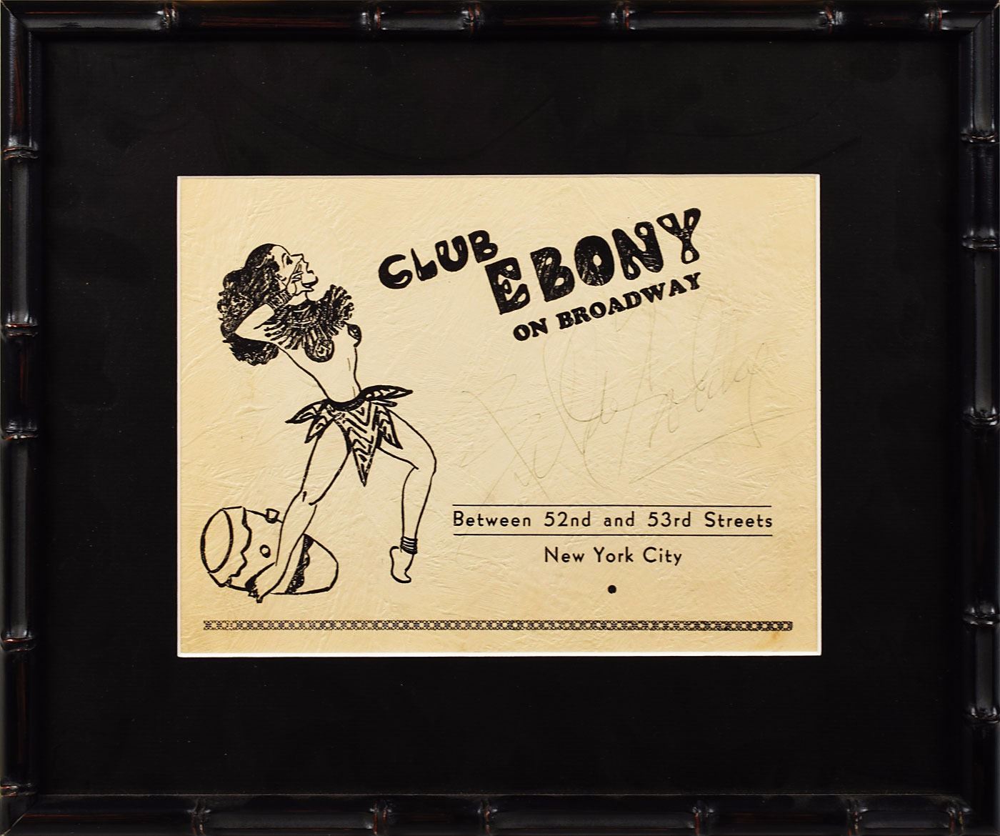 Attractive vintage ink signature, "Billie Holiday,” on an off-white 10.25 x 7.75 sheet promoting New York's Club Ebony on Broadway. Matted and framed to an overall size of 16 x 13.5. In fine condition.