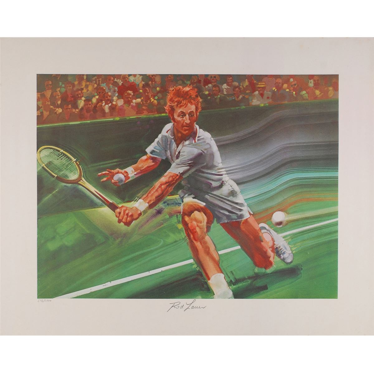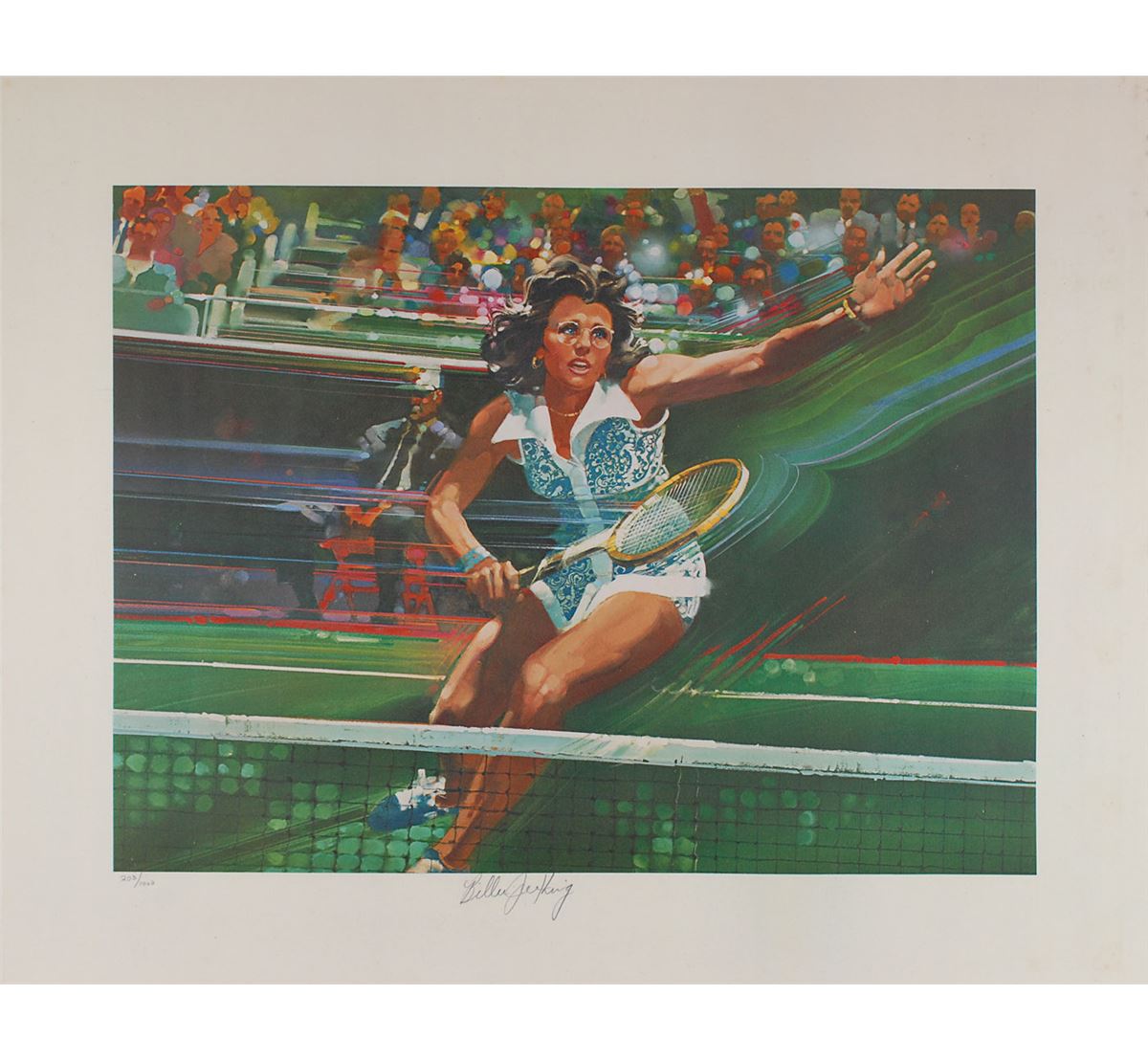 Stylized pair of color limited edition 25 x 20 prints featuring artistic renderings of tennis greats Billie Jean King and Rod Laver, numbered 203/1000 and 572/1000, both signed in the lower border in pencil by the athlete pictured. In overall fine condition, with light foxing and creasing to edges, and a slight block of toning to right border from previous display to the King. These difficult-to-find prints were issued in the 1970s by Sports Illustrated as part of the ‘Living Legend’ series.
