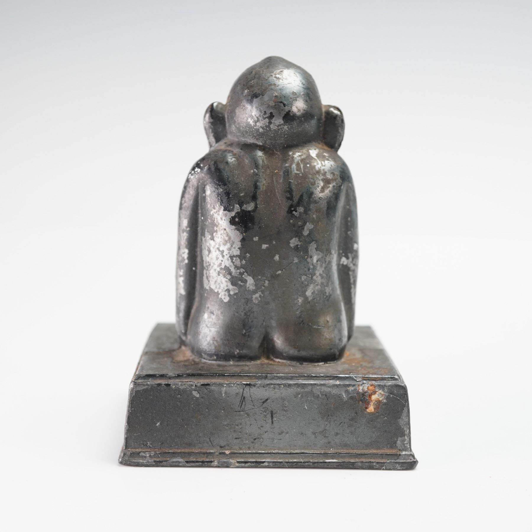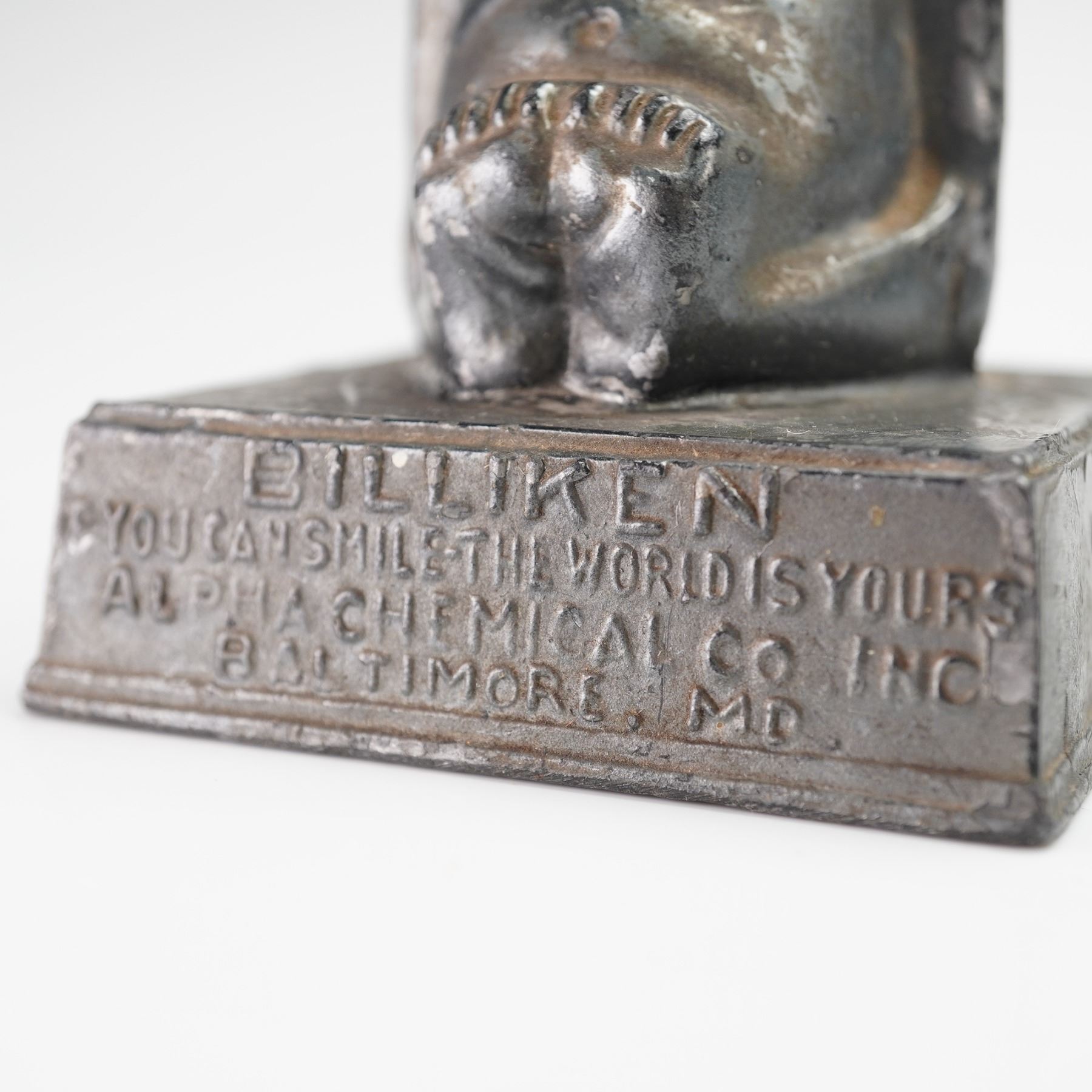This Billiken figurine is made of metal and depicts the charming Billiken figure often considered a symbol of good luck. The figure has a smiling expression sitting on a square base with the inscription BILLIKEN YOU CAN SMILE THE WORLD IS YOURS. Produced by Alpha Chemical Co. Inc. Baltimore MD this piece captures the playful spirit of the Billiken.