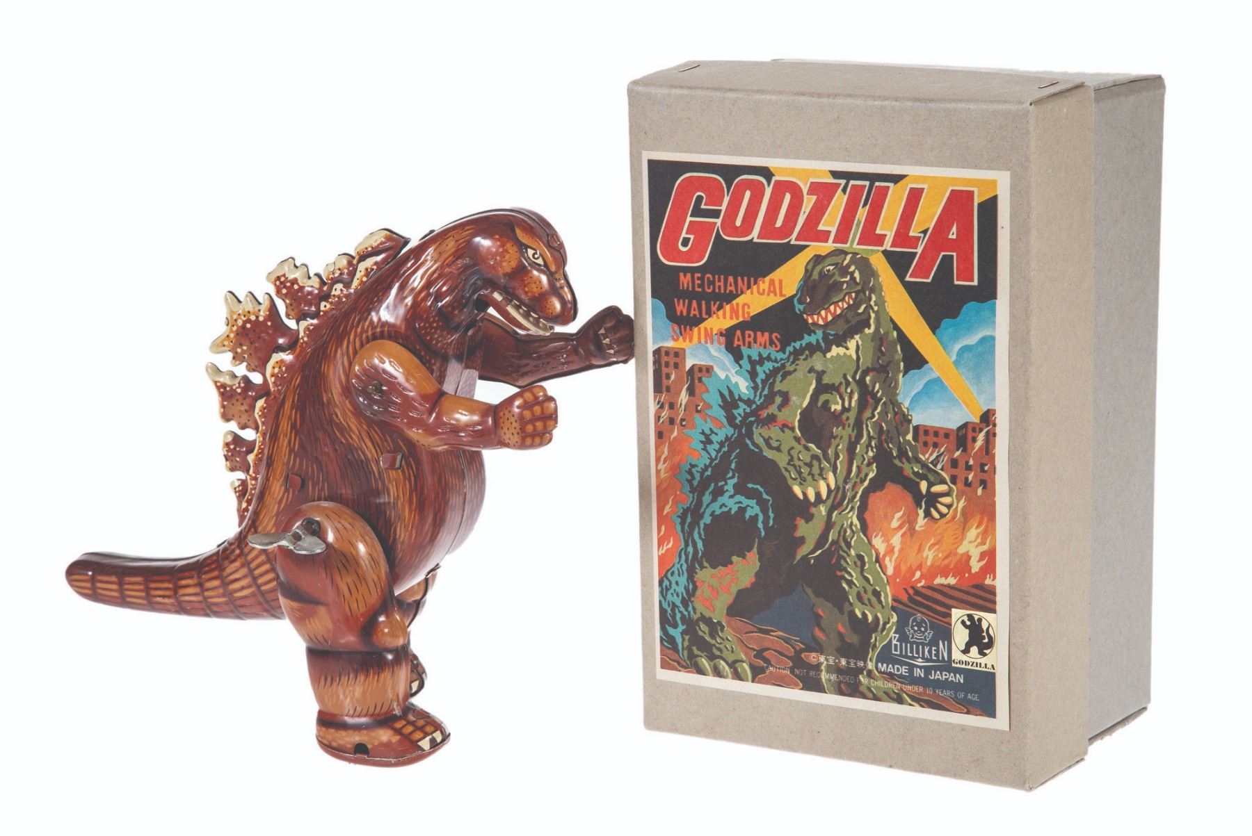 1992. Billiken Tin Wind-Up Godzilla Figure w/ Box (Brown). 6. 75”x4”x6. 25”. VG+ Figure does not appear to be in walking condition, box has small tear on left side.
