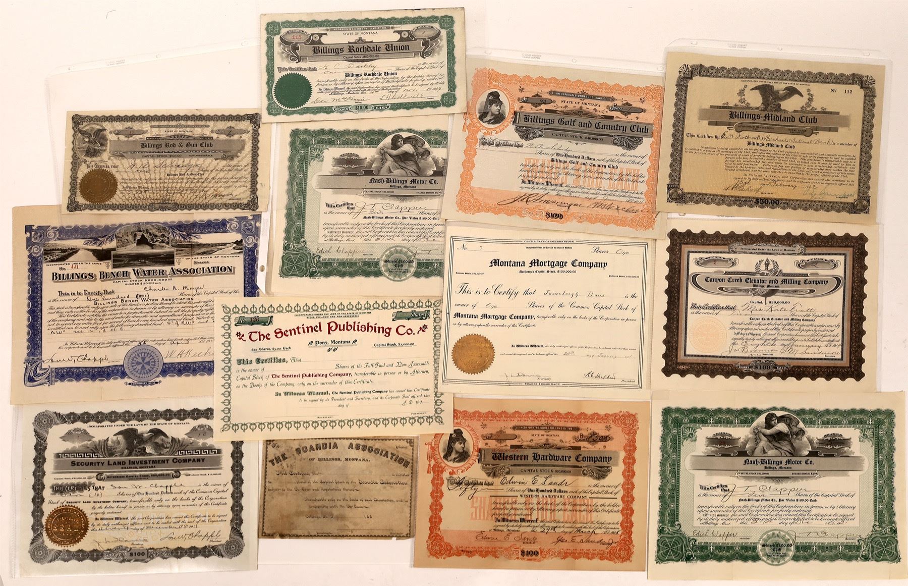 Lot of 13, most different. Includes: Scandia Association (1880s, uniss); Western Hardware Co. (1908); Billings Rod & Gun Club (1914); Billings Rochdale Union (1919); Billings Midland Club (1919); Billings Golf & Country Club (1914); Canyon Creek Elevator & Milling Co. (1914); Nash-Billings Motor Co. (two, 1921); Montana Mortgage Co. (1911); Billings Bench Water Assoc. (1919); Sentinel Publishing Co. (uniss); and Security Land Investment Co. (1911).