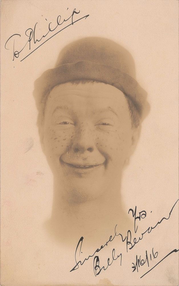 Australian-born vaudevillian and expressive pantomimist (1887–1957) who appeared in 254 American films between 1916 and 1950. Vintage matte-finish 5 x 8 close-up photo of a young Bevan making a funny face and wearing an old derby hat, signed and inscribed in fountain pen to silent actor/comedian Phil Dunham, "To Phillip, Sincerely Yrs., Billy Bevan, 3/16/16.” In fine condition, with some light fingerprint smudges to the blank background. The first Billy Bevan autograph we have ever offered.