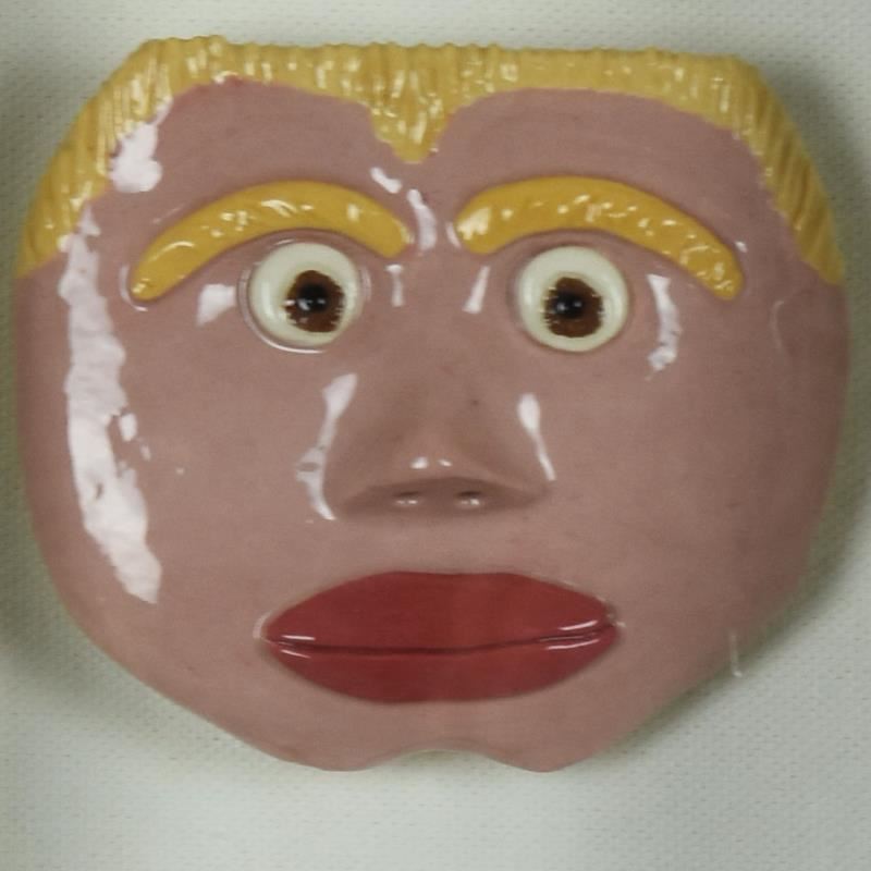 "Billy Buttface" is an original ceramic mask sculpture by George Marlowe. This piece comes suspended and encased in a custom-made Lucite display with signed metallic name plate. Includes Certificate of Authenticity. Measures approximately 8" x 6" x 3" (frame), 3" x 3" (mask).