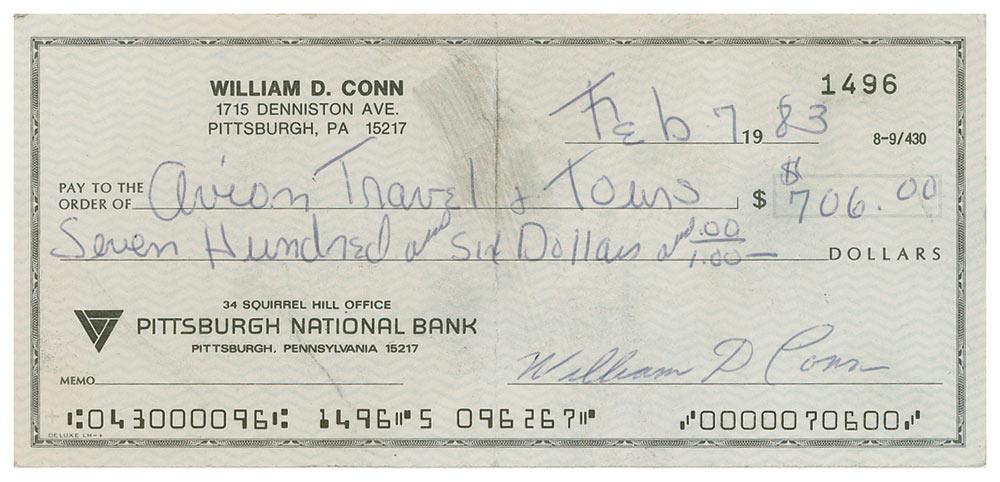 World Light Heavyweight champion, 1939–41. Personal check, 6 x 2.75, filled out in another hand and signed by Conn, “William P. Conn,” payable to Avion Travel & Tours for $706.00, February 7, 1983. In very good condition, with central vertical fold, a couple creases, and scattered soiling to body of check.