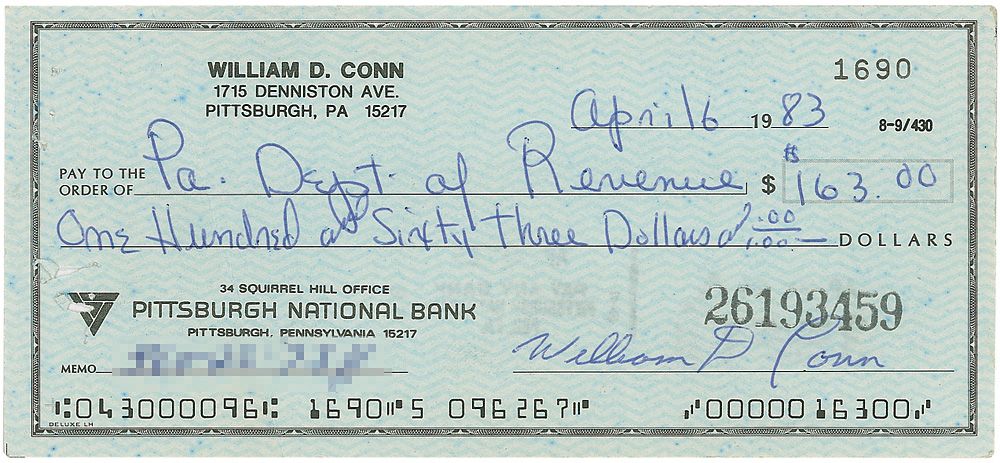 Personal check, 6 x 2.75, filled out in another hand and signed by Conn, “William D. Conn,” payable to PA Dept. of Revenue for $163.00, April 16, 1983. Scattered creases, one through last letter of signature, a few staple holes on left side, and show-through from stamps on reverse, otherwise fine condition.