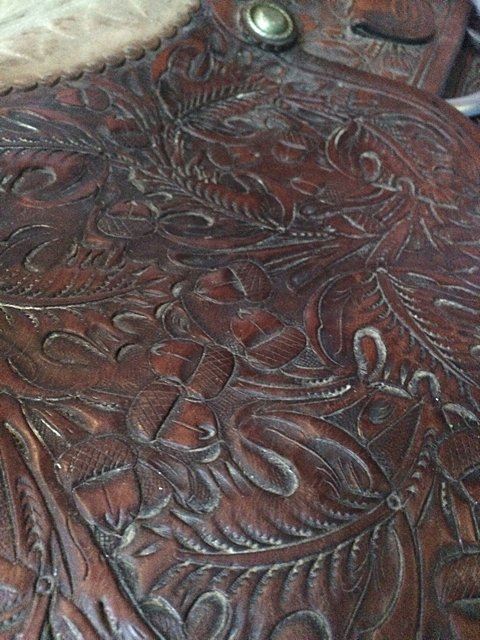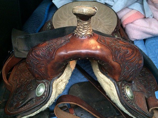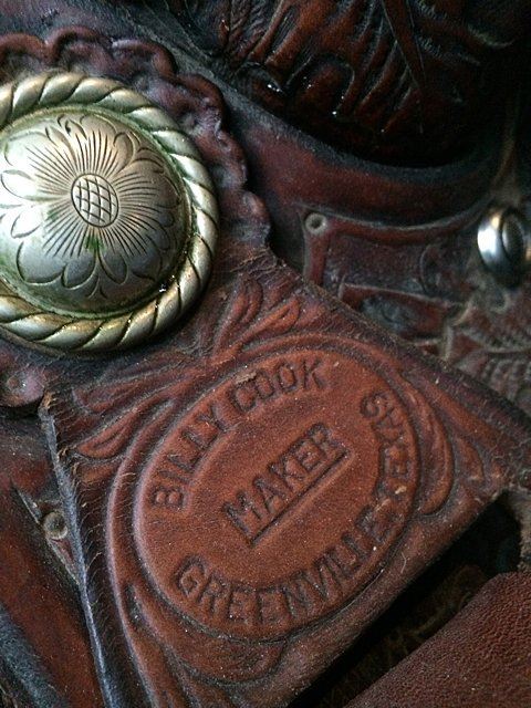 Billy Cook western saddle, Billy Cook, Greenville Texas, reining, cutter, trail, nice saddle with acron tooling throughout and fenders, has hoof pick/tool holder, rawhide wrapped horn.