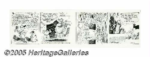 <B>Billy DeBeck - Barney Google and Snuffy Smith Daily Comic Strip Original Art, dated 11-24-31 (King Features Syndicate, 1931).</B></I> Barney Google relives his glory days as an award-winning jockey as he rides Spark Plug again -- right into a doorframe! Barney's jockey, Sunshine, co-stars in this hilarious daily. The image area of the strip measures approximately 17.75" x 4.5". The lettering in the word balloons is pasted-on; otherwise the art is in Excellent condition.