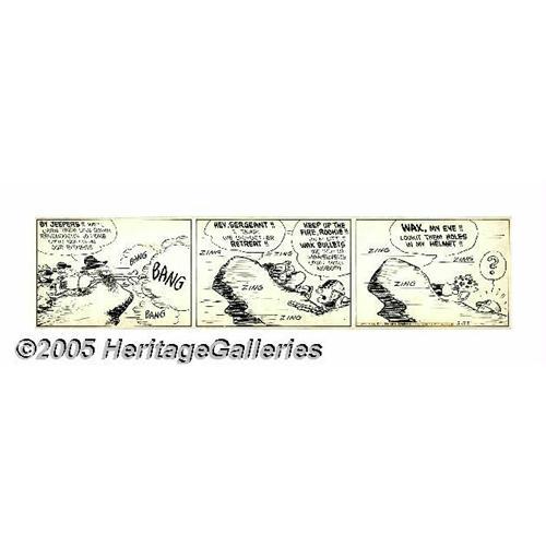 <B>Billy DeBeck - Barney Google and Snuffy Smith Daily Comic Strip Original Art, dated 3-22-41 (King Features Syndicate, 1941).</B></I> Thar's a war goin' on in Hootin' Holler between the hill folks and them ""revenooers"". An amusing and spectacularly-drawn daily by Billy DeBeck. The image area measures 16.5"" x 3.75"" and the artwork is in Excellent condition, with only moderate aging overall. <BR><BR><B>Important notice:</B> Heritage usually auctions material at the rate of 200-250 lots per hour. On some occasions eBay Live bid software or the Internet may not be able to keep up with the pace of the auction. We recommend placing a realistic absentee bid now as insurance to avoid disappointment. Occasionally the auctioneer may eliminate or reject an eBay Live bid, and the auctioneer may also reopen a lot after the close of the eBay live bidding (usually because we missed an audience bid), and may reject your bid even if it shows you as the winning bidder. By bidding via eBay Live, you agree that Heritage may award the lot to another bidder at its sole discretion under the circumstances described above or any other reasonable circumstances. Since eBay bids are not shown to us until we open the lot on the floor, we treat those bids just like floor bids. In most cases the floor responds before the eBay bid is presented to us, due to Internet lag time, so for consistency we have made it a policy that floor bids are always considered first over tie eBay live bids. Also please note that all Heritage lots purchased through eBay Live carry a 20% Buyer's Premium. Please make sure you read the Terms and Conditions before you bid. This lot is being auctioned in conjunction with a live floor auction by Heritage Galleries & Auctioneers. All final auction and invoice information will be supplied by Heritage Galleries & Auctioneers, and all other information should be considered preliminary. Lot:4129 <BR><BR><B>Winning Notification and Billing:</B> After the FINAL session in thi