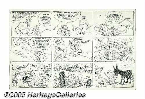 <B>Billy DeBeck - Barney Google and Snuffy Smith Sunday Comic Strip Original Art, dated 6 -15-41 (King Features Syndicate, 1941).</B></I> Hootin' Holler's favorite son, Snuffy, finds modern Army wargames a tad overwhelming, so he takes a break from the action to commune with nature as only he can -- by kissing an army mule! This Sunday was drawn only six months before the Pearl Harbor attack, but cartoon stars such as Snuffy were already preparing for the looming conflict ahead. This charming piece has an image area of 17.5" x 11" and the art is in Excellent condition.