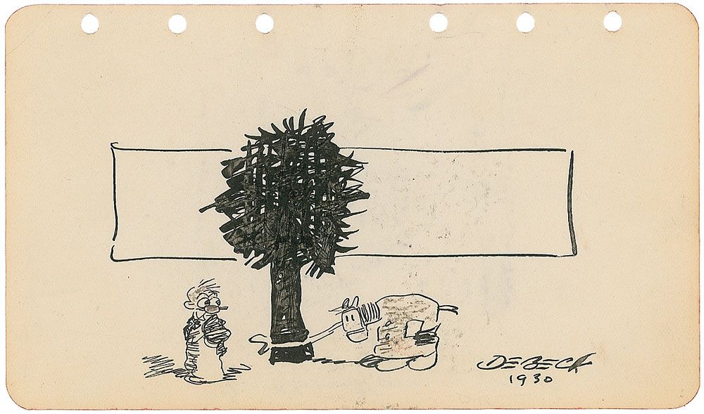 Original vintage signed ink and pencil sketch of Barney Google on an off-white 6 x 3.5 album page, signed in black ink, “DeBeck 1930.” In fine condition.
