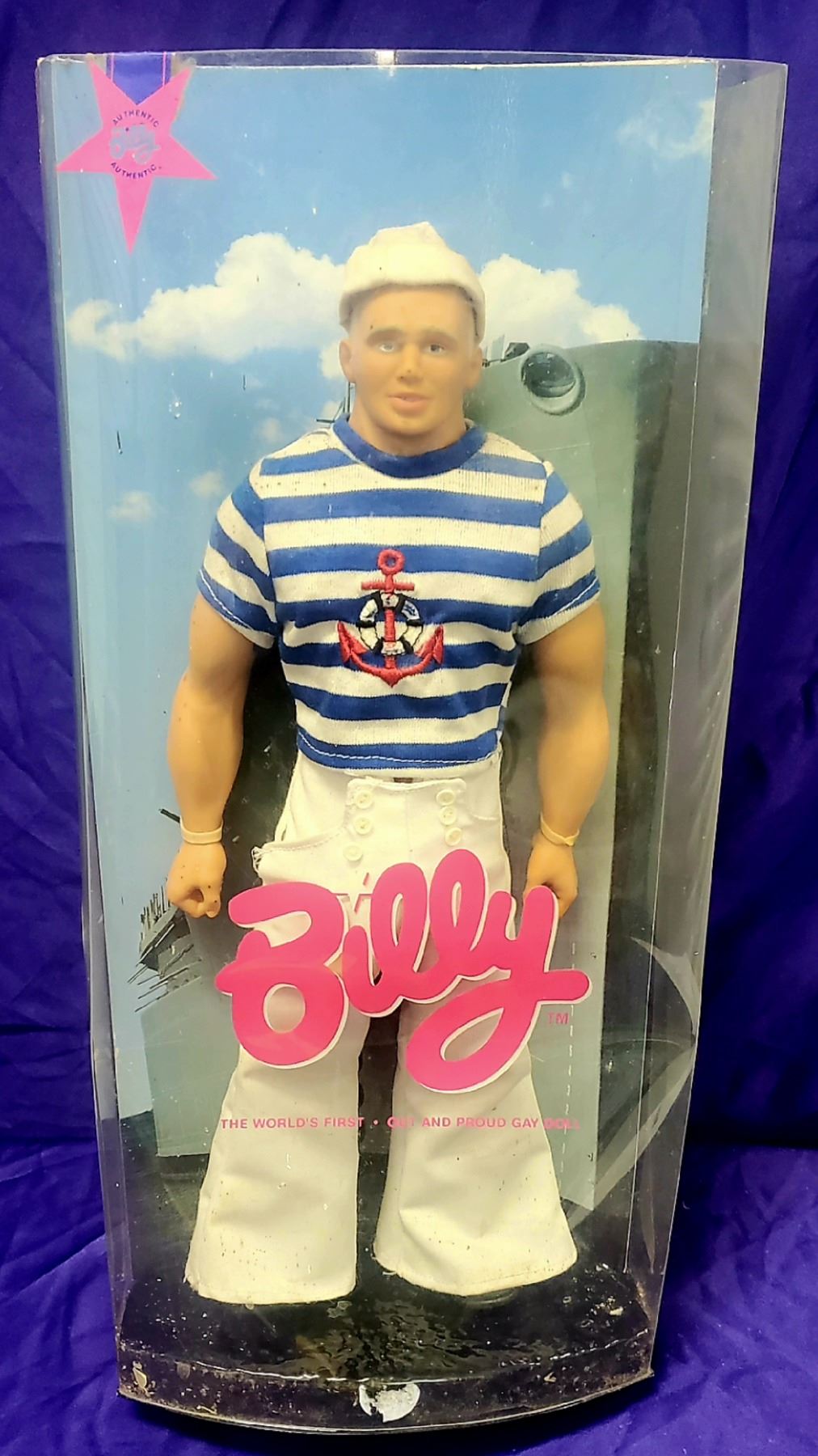 Billy doll, "The World's First Out and Proud Gay Doll". Billy is dressed in a Sailor Outfit with the orginal packaging. The doll is 13 inches H.