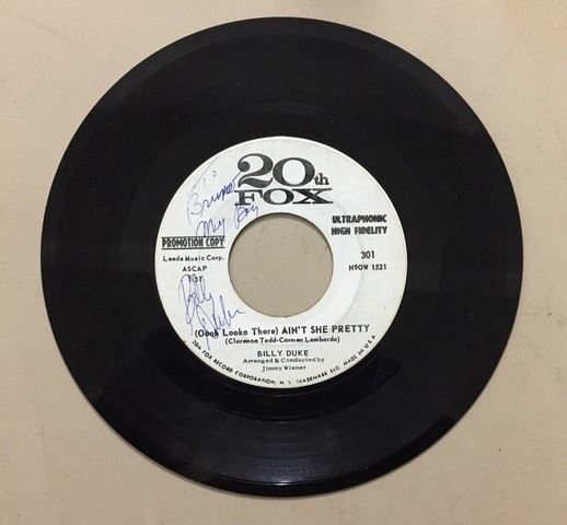 Billy Duke "20th Fox" Promotion Copy vinyl record, 2 songs between the 2 sides of the record include, "(Ooh Look There) Ain't She Pretty"; "Timbuctu", autographed by Billy Duke on the vinyl record.