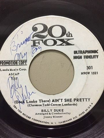 Billy Duke "20th Fox" Promotion Copy vinyl record, 2 songs between the 2 sides of the record include, "(Ooh Look There) Ain't She Pretty"; "Timbuctu", autographed by Billy Duke on the vinyl record.