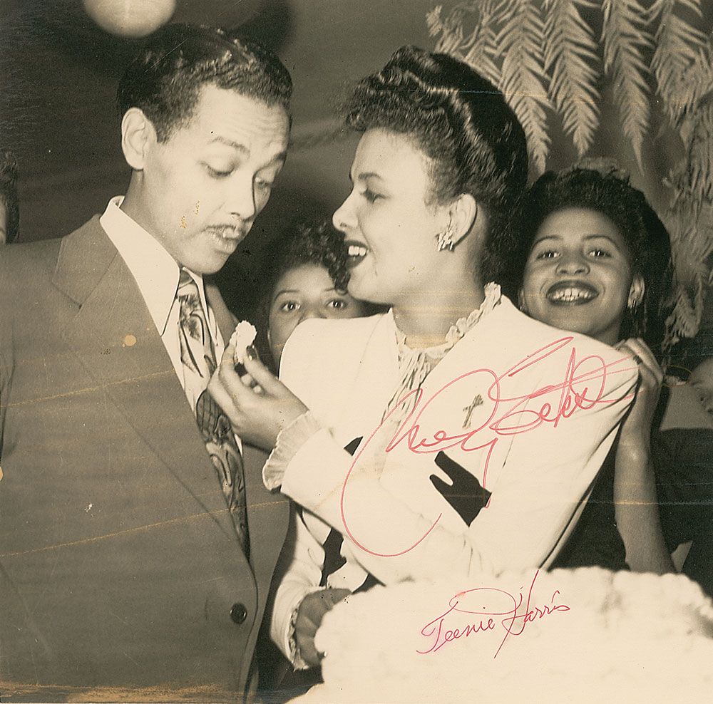 Vintage matte-finish 10.25 x 10 Teenie Harris photo of Eckstine and Lena Horne at the Loendi Club in Pittsburgh, in October 1944, signed later in red felt tip by Eckstine, and also signed by the photographer, Teenie Harris. In fine condition, with trimmed edges and some light horizontal streaking. Accompanied by a satin-finish 10 x 8 second-generation Harris photo of Eckstine, Earl ‘Fatha’ Hines, Mary Lou Williams, and Erroll Garner around a piano. Harris was an accomplished African-American photographer who chronicled life in the black neighborhoods of the city for the Pittsburgh Courier. His work was rarely seen outside of Pittsburgh, until after his death in 1998.