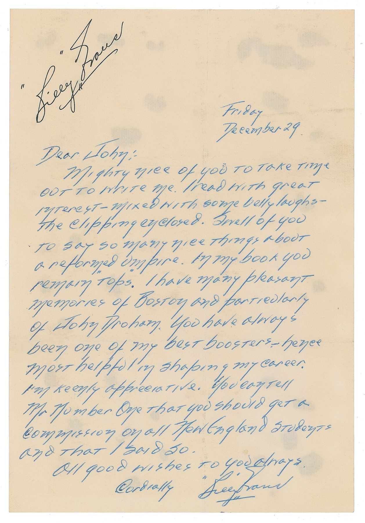 Handwritten letter signed "Billy Evans," one page, 7.25 x 10.5, personal letterhead, December 29, no year. Letter to John Drohan, a reporter and baseball writer for the Boston Traveler, in part: "I had with great interest—mixed with some belly laughs—the clipping enclosed. Swell of you to say so many nice things about a reformed umpire. In my book you remain 'tops.' I have many pleasant memories of Boston and particularly John Droham [sic]. You have always been one of my best boosters—hence most helpful in shaping my career. I'm keenly appreciative. You can tell Mr. Number One that you should get a commission on all New England students and that I said so." In fine condition.