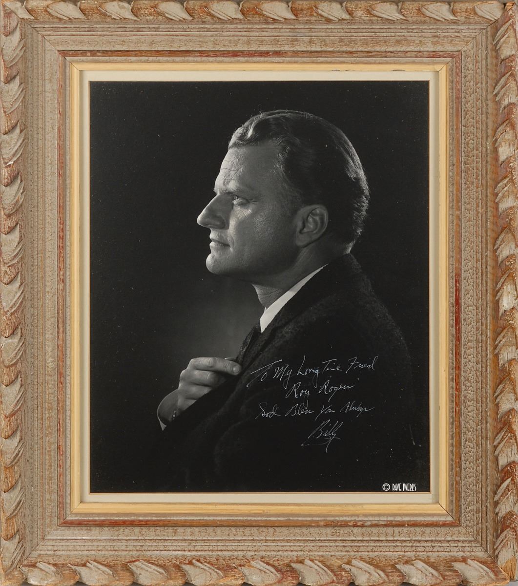 Unique vintage matte-finish 10 x 13 portrait of Graham in profile by Dave Iwerks, signed and inscribed in white ink to the famed cowboy star, “To My Long Time Friend Roy Rogers, God Bless You Always, Billy.” Displayed in its original frame to an overall size of 15.5 x 18.5. In fine condition. Roy Rogers and Dale Evans were involved with Graham and his religious ‘crusades’ for a span of decades, and undoubtedly treasured this magnificent inscribed photograph.