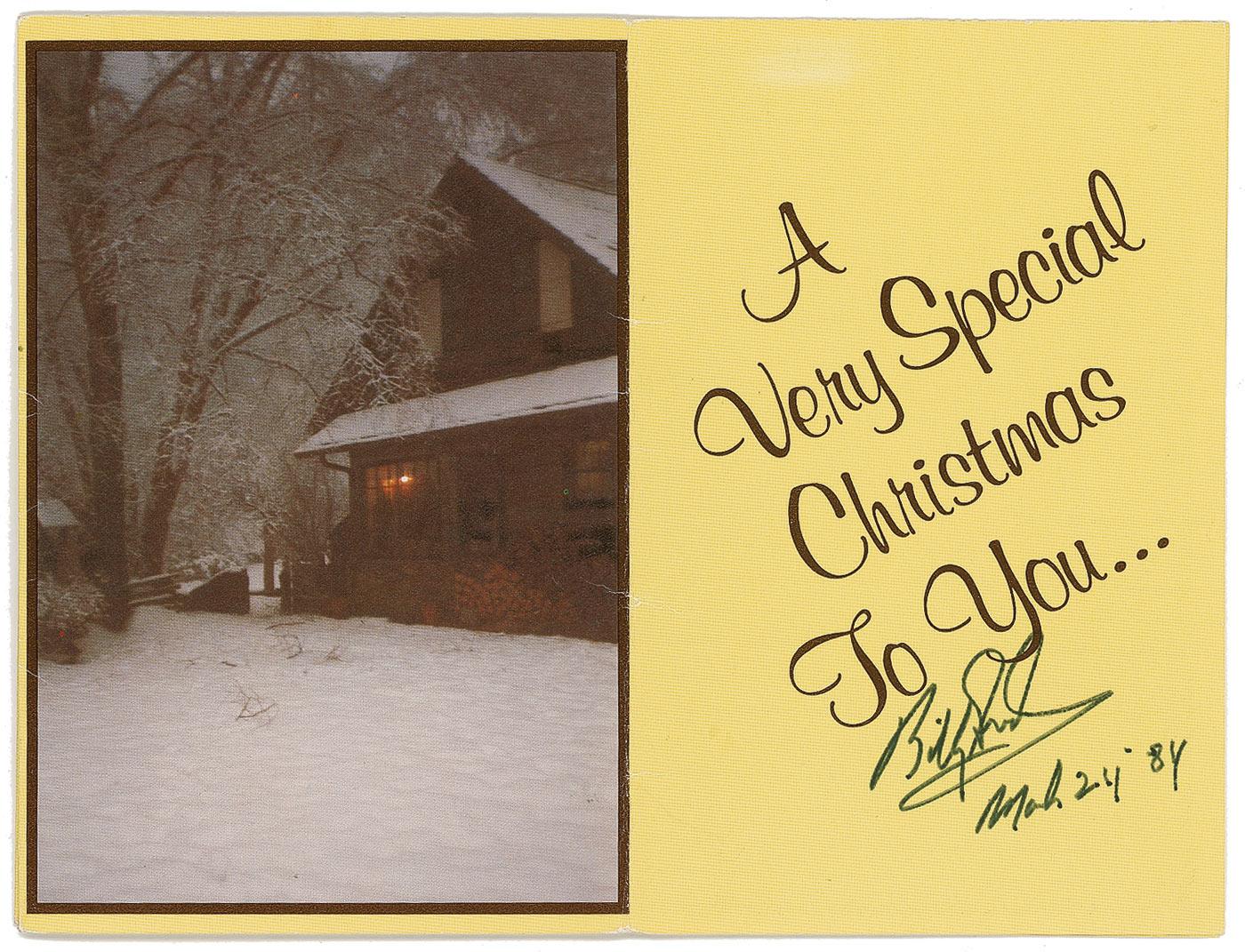 Large color fold-out Christmas card, measuring 5 x 21.75 opened, signed “Billy Graham, Nov. 24, ‘84” on the cover panel. The inside panels feature photos of Graham, his wife, his children, their spouses, and his grandchildren. In fine condition, with a bit of light irregular adhesion to signature.