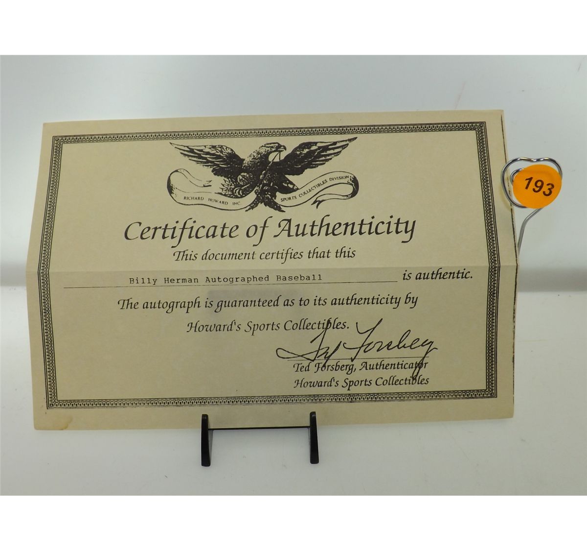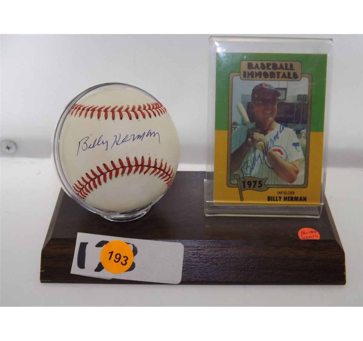 Billy Herman Autographed Baseball & Card. Rawlings Official ALB/ Stand & Trading Card. Appraised or estimated retail value $500. COA by Howards Sports Collectibles. All Sales Final. Please see terms and conditions of auction.