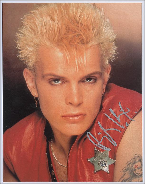 Color glossy 11 x 14 close-up photo of the young punk icon sporting a sheriff’s badge, signed in silver ink. In very fine condition.