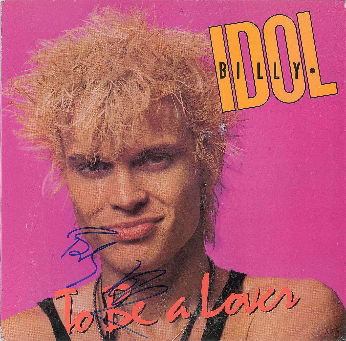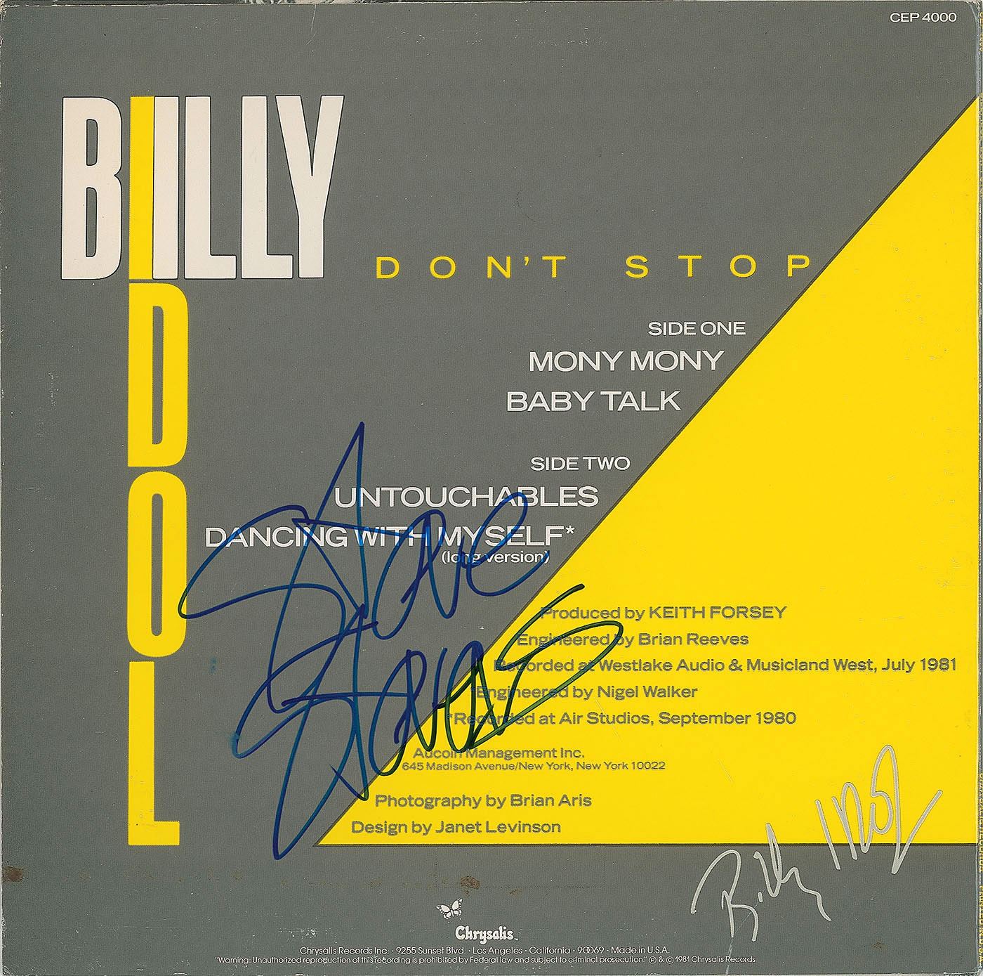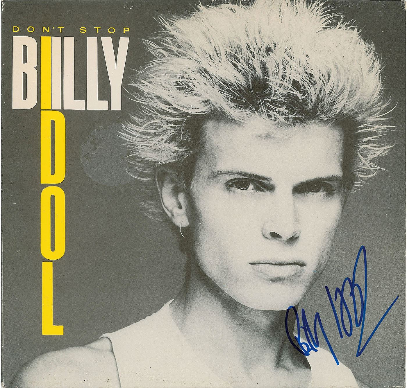 Two single albums signed on the front cover in blue felt tip by Billy Idol: Don't Stop and To Be a Lover. In overall fine condition, with light scuffing, and sticker residue to Don't Stop. The records are included.