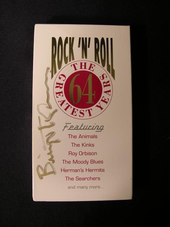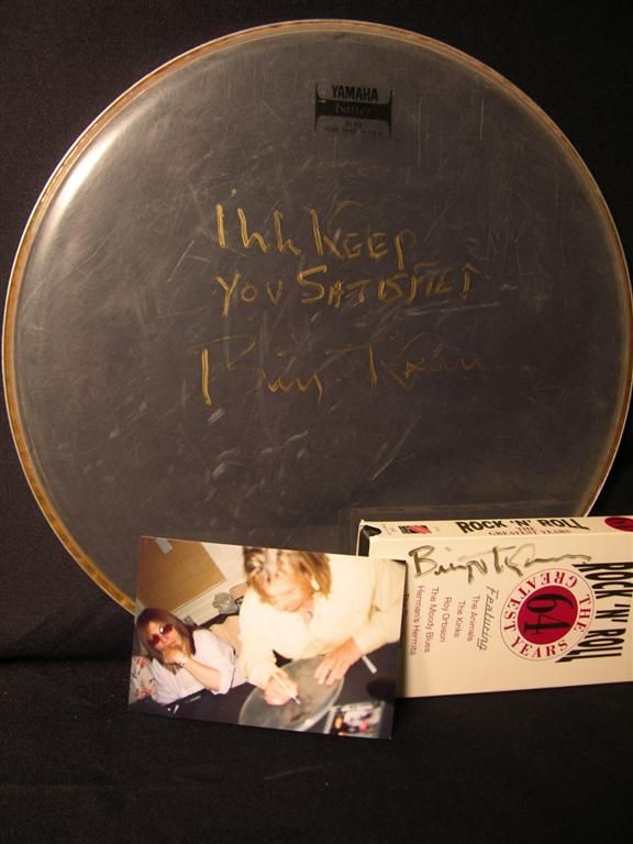 Drum head signed by Billy J. Kramer in gold ink, who adds the title of his hit 1963 song I'll Keep You Satisfied, which spent 13 week in the UK charts. This lot further includes a VHS copy of the program Rock N' Roll: The Greatest Years, 1964 which has also been signed by Kramer. A photo of Kramer signing the drum is included. (Drum Head Diameter 15.5")