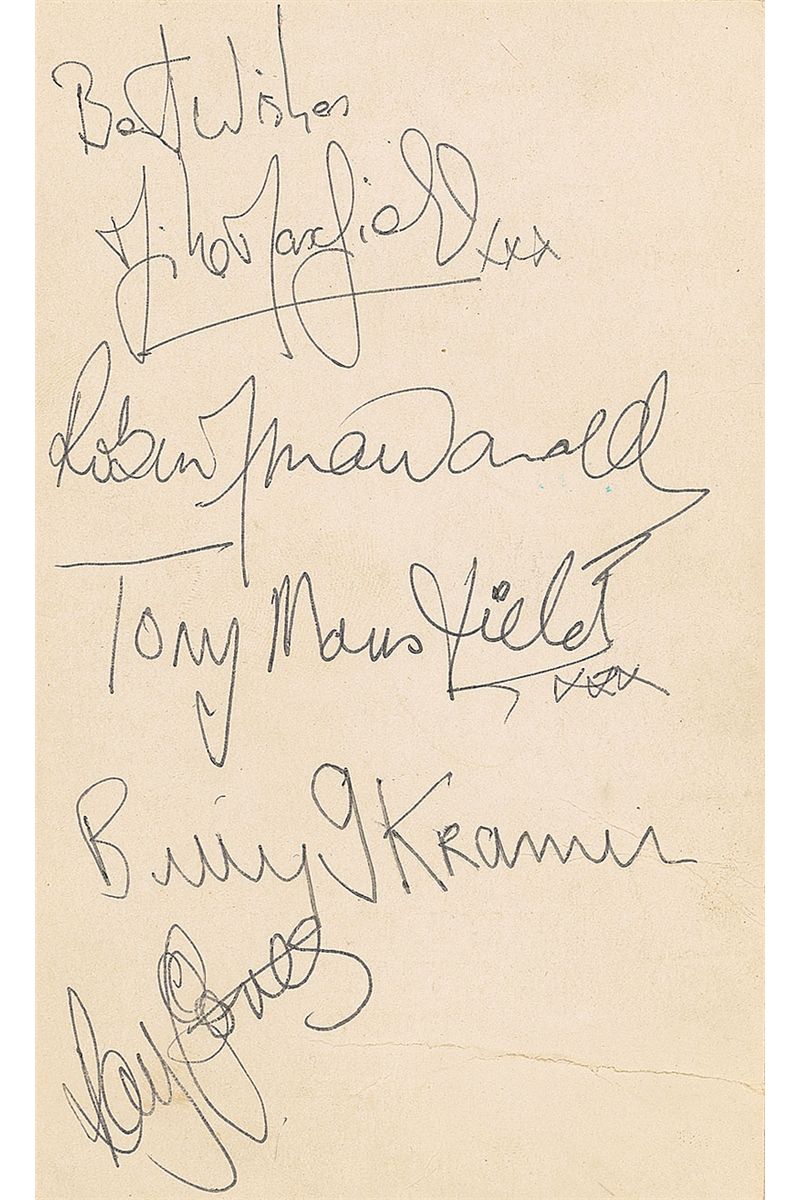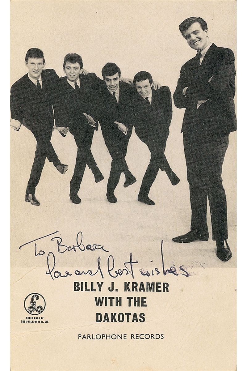 Vintage 3.5 x 5.75 Parlophone promotional cardstock photo, signed on the reverse in black ballpoint by Billy J. Kramer, Mike Maxfield, Robin McDonald, Tony Mansfield, and Ray Jones. Front has also been inscribed in black ballpoint in an unknown hand to Barbara. A couple horizontal creases and light impressions to front from signatures on reverse, otherwise fine condition. Accompanied by a certificate of authenticity from Tracks.