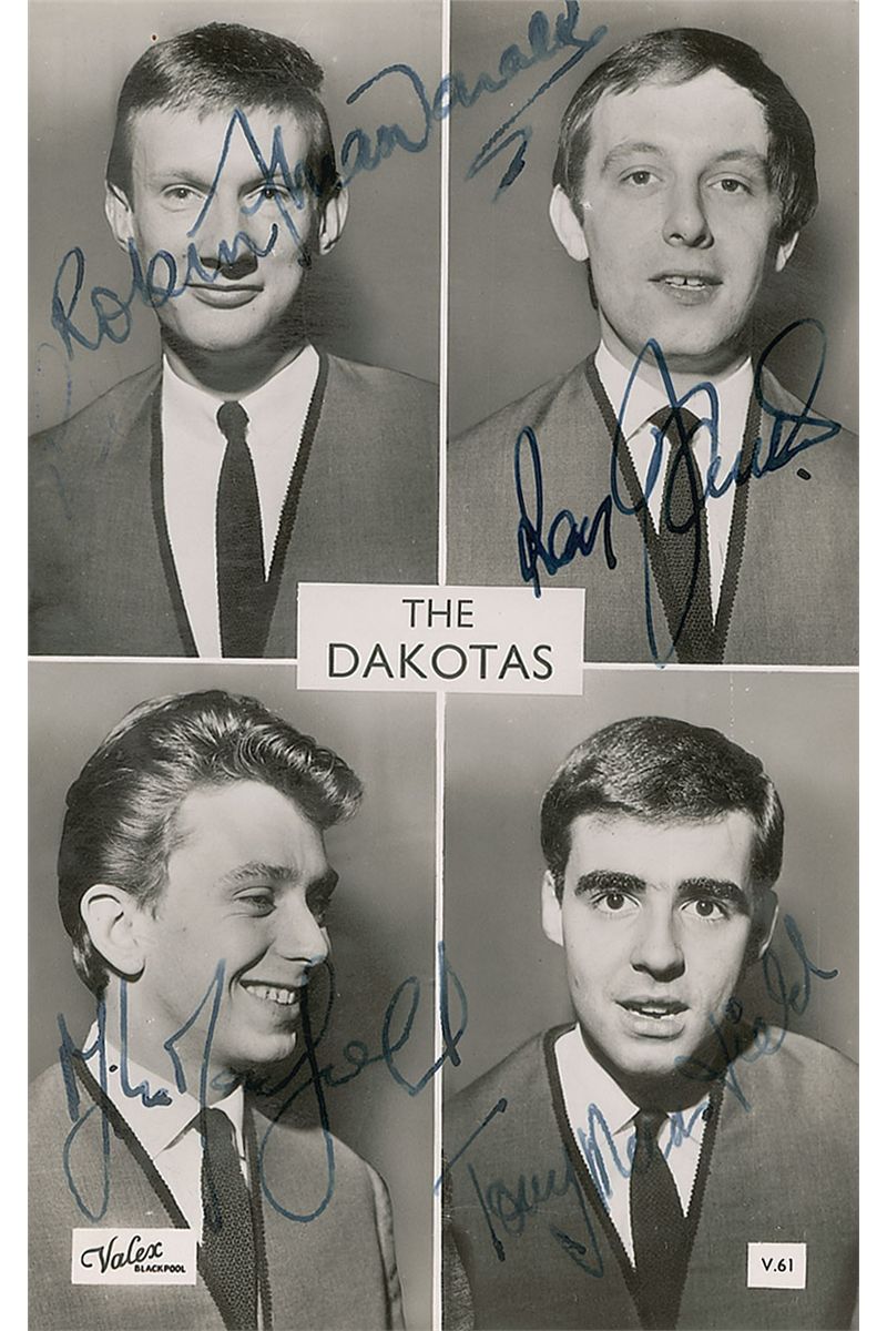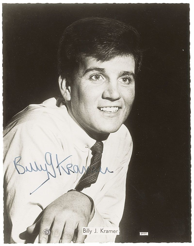 Vintage 6 x 7.5 deckle-edge photo of Billy Kramer, signed in fountain pen; and a vintage 3.5 x 5.5 composite postcard photo, signed in fountain pen by Robin McDonald, Mick Green, Mike Maxfield, and Ray Jones. In fine condition. Accompanied by a certificate of authenticity from Tracks.