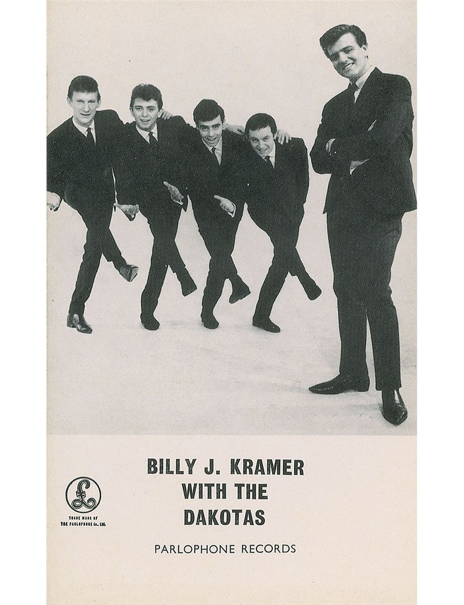 Vintage ballpoint signatures of Billy J. Kramer, Mike Maxfield, Tony Mansfield, Ray Jones, and Robin McDonald on two album pages, with Kramer adding a brief inscription. In fine condition. Accompanied by an original Billy J. Kramer and The Dakotas Parlophone Records promo card and a certificate of authenticity from Tracks.