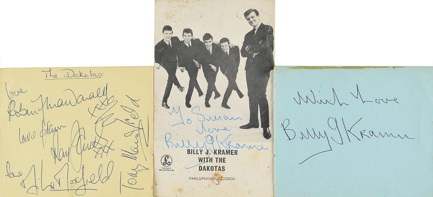 Group lot of signatures relating to Billy J. Kramer and The Dakotas: a black ballpoint signature, "With love, Billy J. Kramer," on a blue 4.5 x 3.75 album page; a Parlophone Records promo card for the band, 3.5 x 5.75, signed and inscribed in blue ballpoint, "To Susan, love, Billy J. Kramer"; and black ballpoint signatures, "Love, Robin McDonald, xxx," "Love from, Ray Jones, xxx," "Tony Mansfield," and "Love, Mike Maxfield," on a yellow 4.5 x 3.75 album page, with the reverse signed and inscribed in black ballpoint by Gerry Marsden of Gerry and the Pacemakers. In overall very good to fine condition, with soiling, and a small hole, to the single-signed photo.