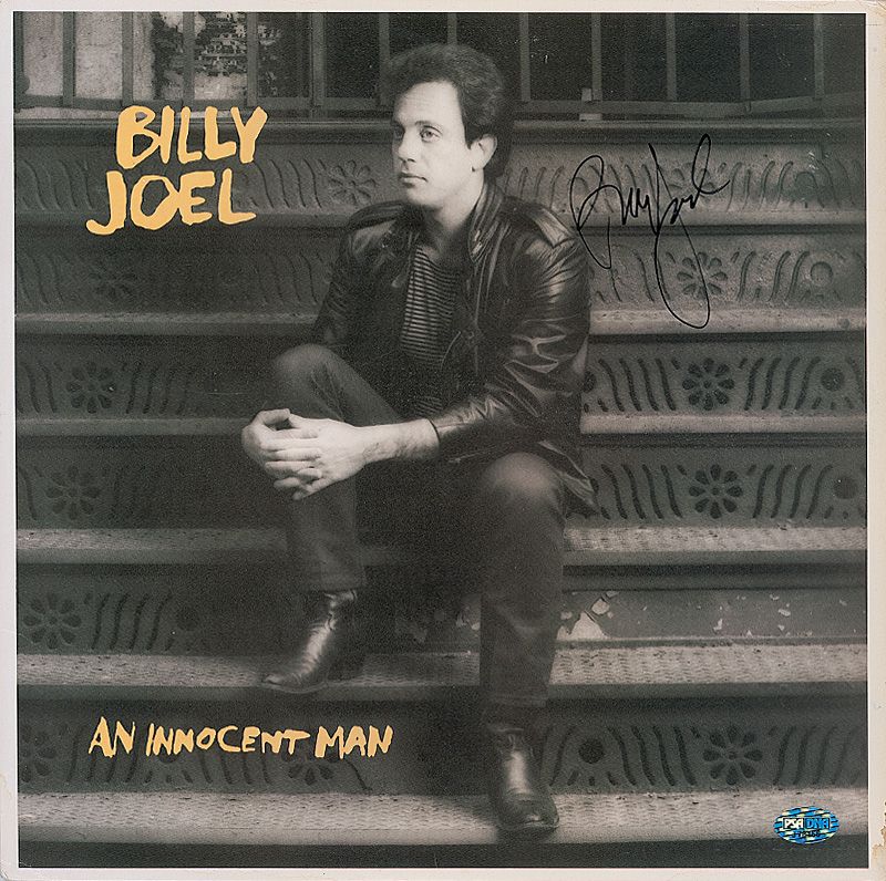 An Innocent Man album signed on the front cover in black felt tip. In fine condition, with a PSA/DNA authentication label affixed to bottom corner, scattered surface impressions, and some light damp staining to edges. The record is included.