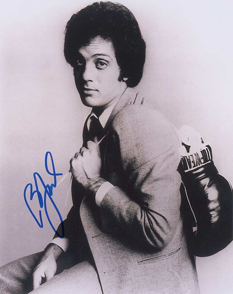 Satin-finish 8 x 10 photo of Joel with a pair of boxing gloves slung over his shoulder, signed in blue felt tip. In very fine condition.