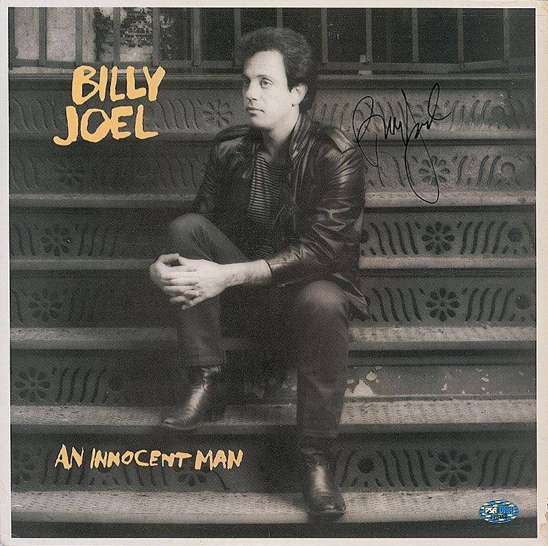An Innocent Man album signed on the front cover in black felt tip. In fine condition, with a PSA/DNA authentication label affixed to bottom corner, scattered surface impressions, and some light dampstaining to edges. The record is included.