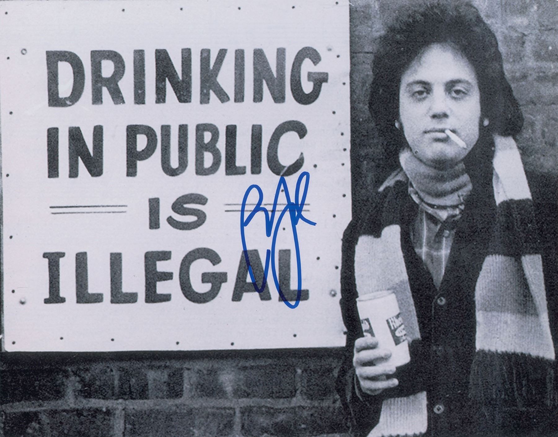 Glossy 14 x 11 photo of Billy Joel smoking and enjoying a beer in front of a sign that reads, 'Drinking in Public Is Illegal,' signed in blue felt tip. In fine condition, with a few small creases and somewhat grainy image quality.