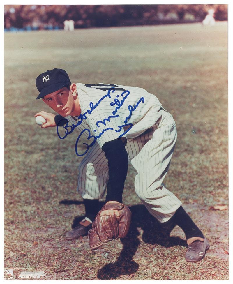 Color glossy 8 x 10 photo of Martin fielding a grounder in his Yankee pinstripes, signed in blue felt tip, “Best always, Billy Martin, Yankees.” In fine condition, with a few scattered light bends and creases.