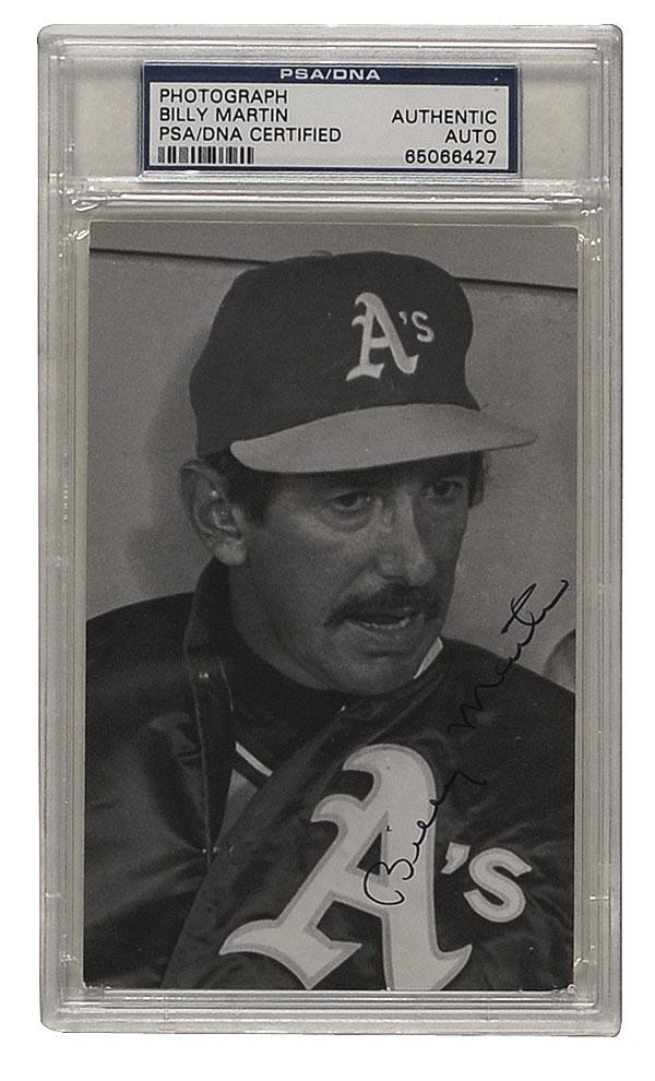 Matte-finish 3.5 x 5.5 photo of Martin while managing the Oakland A’s, signed in black ink. Encapsulated in a plastic PSA/DNA authentication holder. In fine condition.