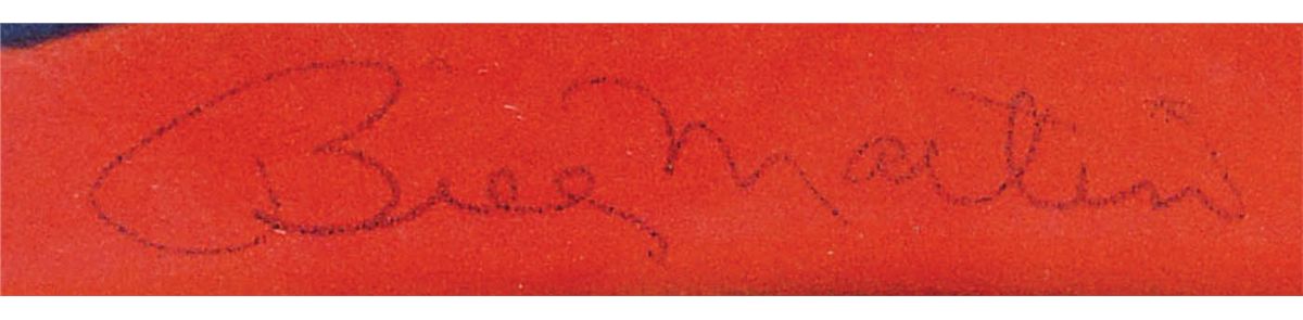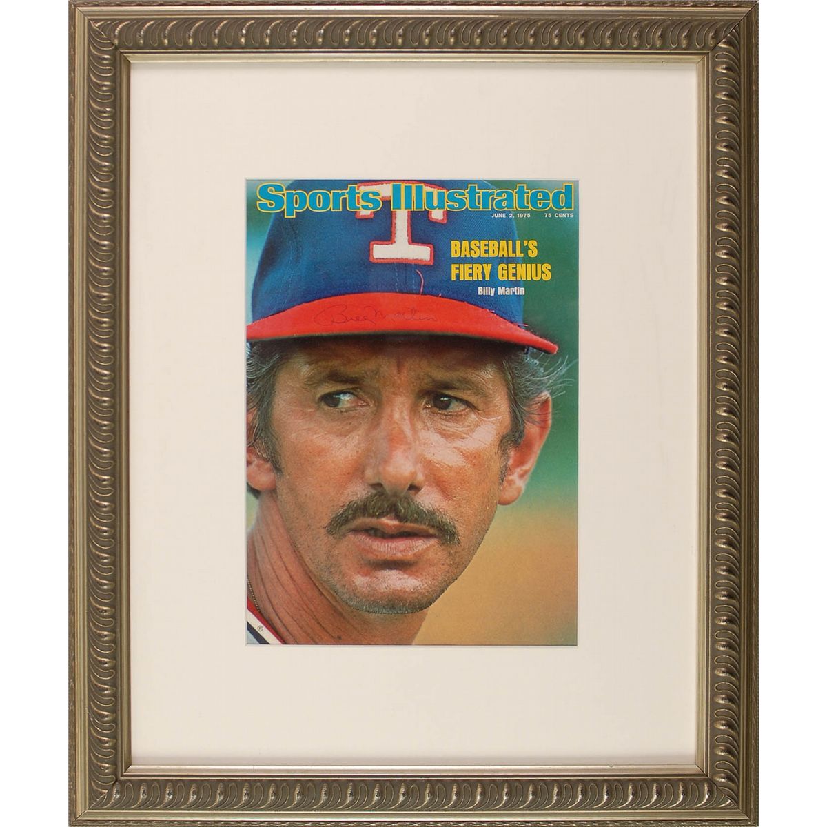 Cover from the June 2, 1975, issue of Sports Illustrated, picturing Martin in his Rangers uniform, signed in blue ballpoint by Martin. Matted and framed to an overall size of 16 x 19.25. In fine condition.