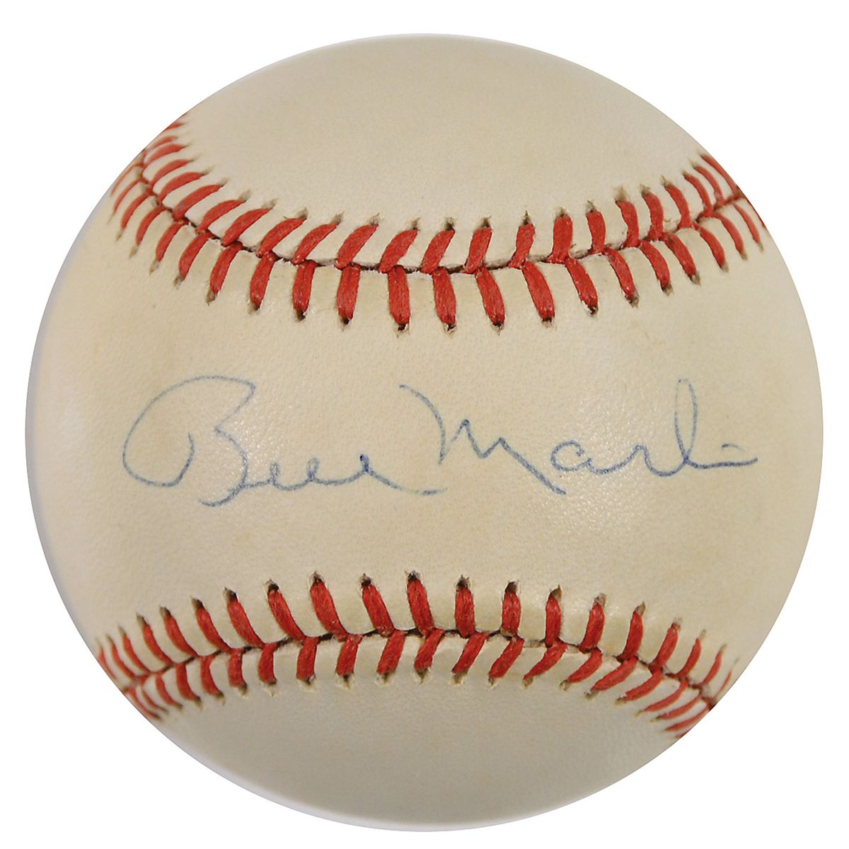 Official Rawlings American League baseball signed in blue ballpoint on the sweet spot. In very good condition, with uniform toning to ball and some light mirorring of stamps from resting against another ball.