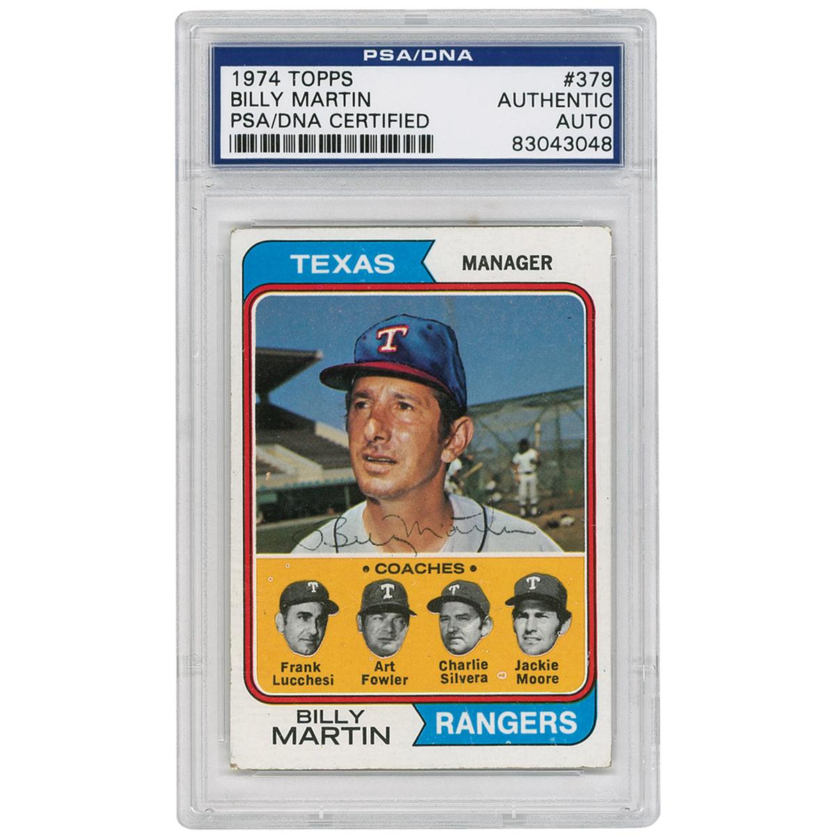 Billy Martin Topps baseball trading card, signed on the front in black ballpoint by Martin. Encapsulated in a plastic PSA/DNA authentication holder. In fine condition, with the signature a shade light but still fully legible.
