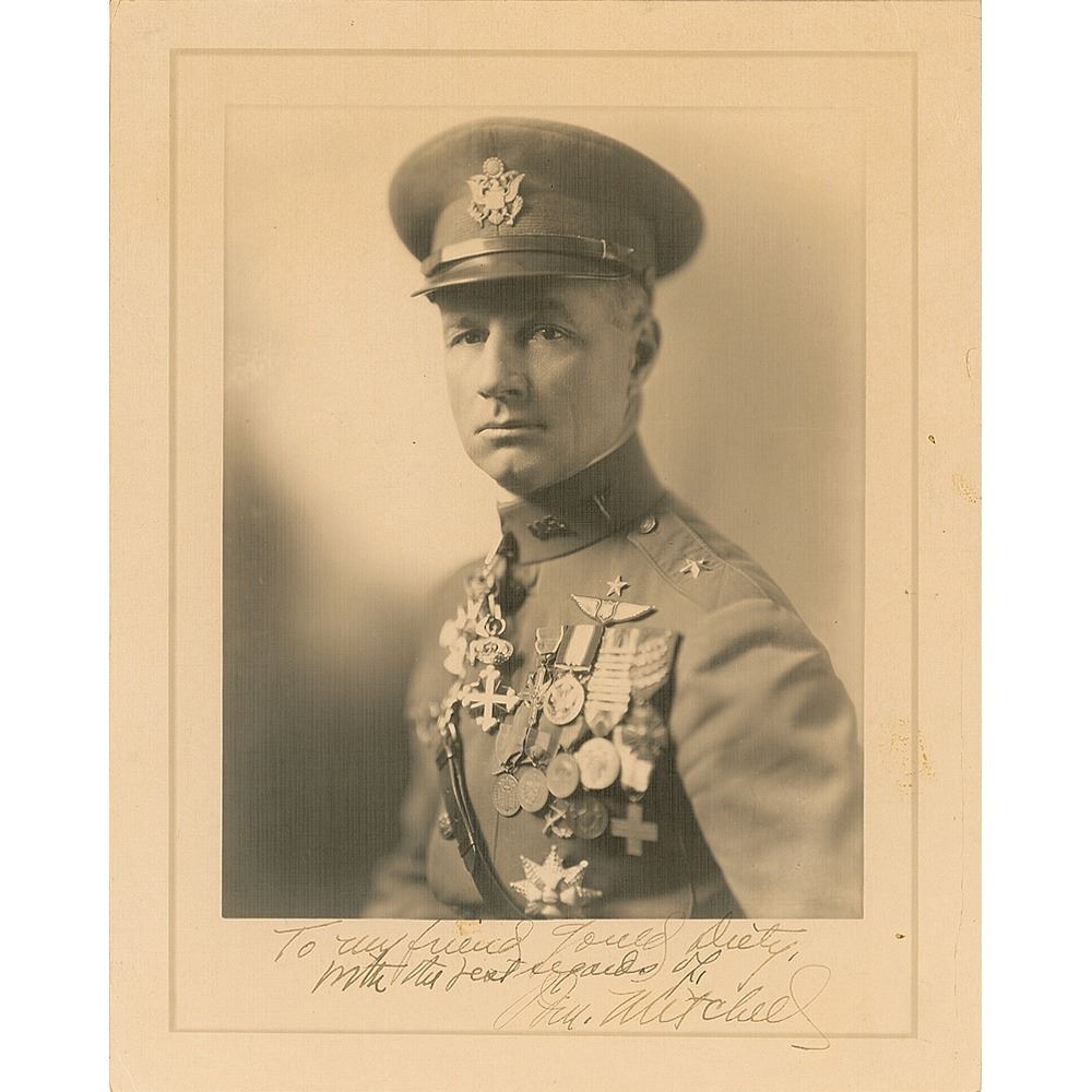 American World War I ace (1879-1936) regarded as the father of the US Air Force, whose zealous ambition and vocal criticism of the War and Navy departments following the war led to a court-martial and his resignation. Vintage matte-finish 10 x 12.75 portrait of Mitchell wearing his decorated military uniform, signed and inscribed in fountain pen, "To my friend Gould Dietz, with the best regards of, Bill. Mitchell.” In fine condition, with a small repaired tear to the right edge. Mitchell remains rare in signed photos of this size—an impressive and desirable pose.