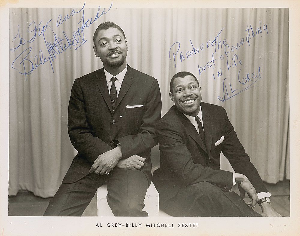 Glossy 10 x 8 photo of the jazz greats, signed and inscribed in blue ballpoint, “To Irv and Freda, Billy Mitchell,” and “Pardner, The best of everything in life, Al Grey.” Light scattered creasing and surface impressions, minor toning to edges, and staple holes to corners, otherwise fine condition.