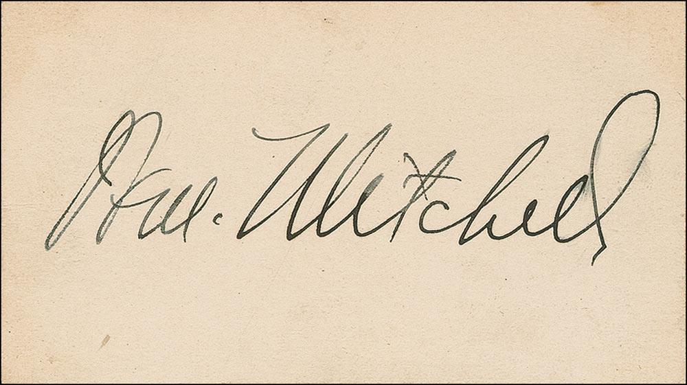 American World War I ace (1879–1936). His zealous ambition, overreaching bravado, and vocal criticism of the War and Navy departments following the war led to a court-martial, a guilty verdict, and prior to a suspension, his resignation from the military in 1926. Vintage ink signature, “Wm. Mitchell,” on an off-white 4 x 2.25 card. Light brush to end of last name, as well as a bit of scattered light toning and soiling, otherwise fine condition.