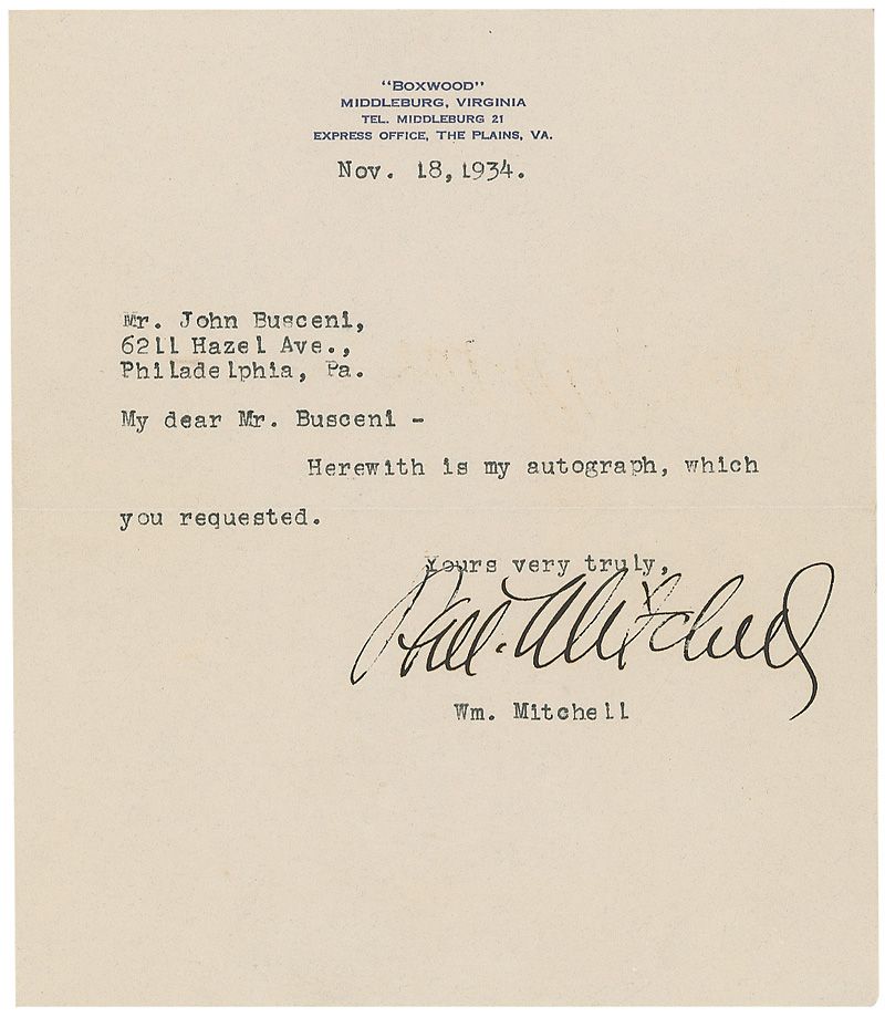 American World War I ace (1879–1936). His zealous ambition, overreaching bravado, and vocal criticism of the War and Navy departments following the war led to a court-martial, a guilty verdict, and prior to a suspension, his resignation from the military in 1926. TLS signed “Wm. Mitchell,” one page, 6 x 7, Boxwood letterhead, November 18, 1934. Brief letter to a collector. In full: “Herewith is my autograph, which you requested.” In fine condition, with a bit of light mirroring of signature and a couple light creases.