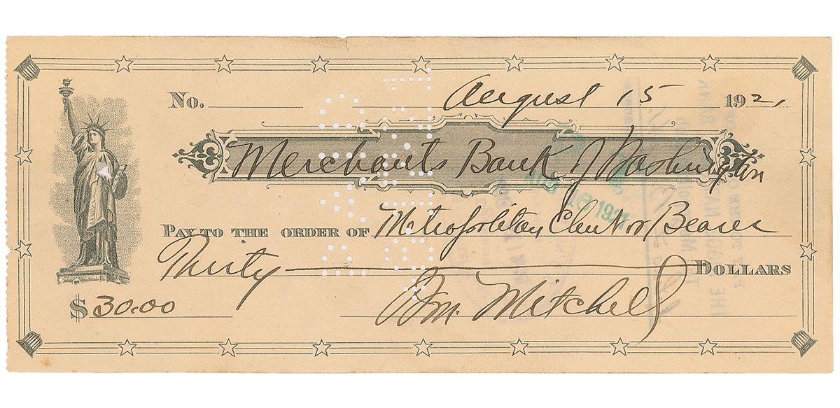 American World War I ace (1879–1936) regarded as the father of the US Air Force, whose zealous ambition and vocal criticism of the War and Navy departments following the war led to a court-martial and his resignation. Bank check, 8 x 3.25, filled out and signed by Mitchell, “Wm. Mitchell,” payable to Metropolitan Club or Bearer for $30.00, August 15, 1921. In fine condition, with cancellation holes touching opening stroke of signature, some mild toning, and a small tear to top edge.