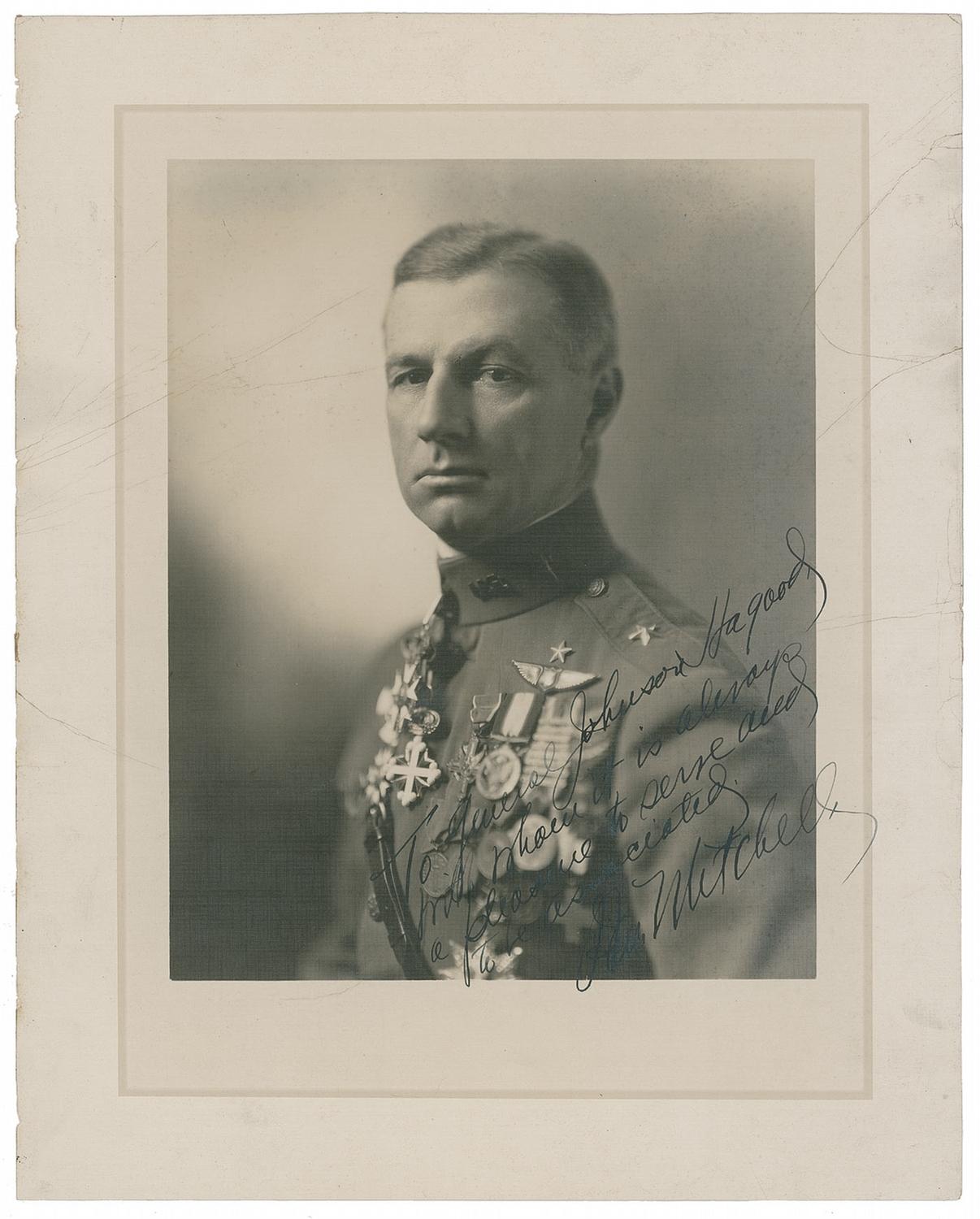 American World War I ace (1879–1936). His zealous ambition, overreaching bravado, and vocal criticism of the War and Navy departments following the war led to a court-martial, a guilty verdict, and prior to a suspension, his resignation from the military in 1926. Vintage matte-finish 11 x 13.75 photo of Mitchell in full dress uniform and a chest full of medals, signed and inscribed in fountain pen “To General Johnson Hagood, with whom it is always a pleasure to serve and to be associated, Wm. Mitchell.” In very good condition, with noticeable creases to borders, with a few extending into image, and some scattered light border soiling. Johnson Hagood (1873–1948) was commissioned in the artillery, and served in France in World War I, where he created the Services of Supply. His decorations include the Distinguished Service Medal and Commander of the Légion d'honneur. Excellent military association.
