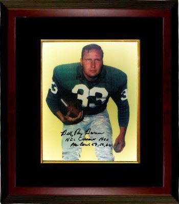 Billy Ray Barnes was drafted in the second round of the 1957 NFL Draft by the Philadelphia Eagles. He made the Pro Bowl his first three years in the league (1957–1959) and was a key member of the backfield during the Eagles' 1960 NFL Championship team. During the title game against the Green Bay Packers, Barnes ran the ball 13 times for 42 yards. He had a nine-yard run and key 13-yard pass reception on the game-winning drive, and blocked Packer defensive end Bill Quinlan that helped Ted Dean to score the winning touchdown. Billy Ray Barnes has hand signed this Philadelphia Phillies 8x10 Photo with NFL Champs 1960 and Pro Bowl 58, 59, 60 inscriptions. Certificate of Authenticity from Athlon Sports. Custom Black Mat and Premium Mahogany Frame as shown.